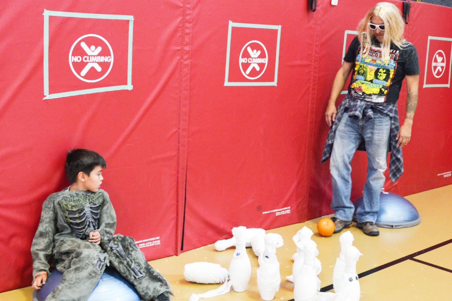 John “Kuch” Oberly, dressed as a zombie and John Oberly as Kurt Cobain run the pumpkin bowling game.