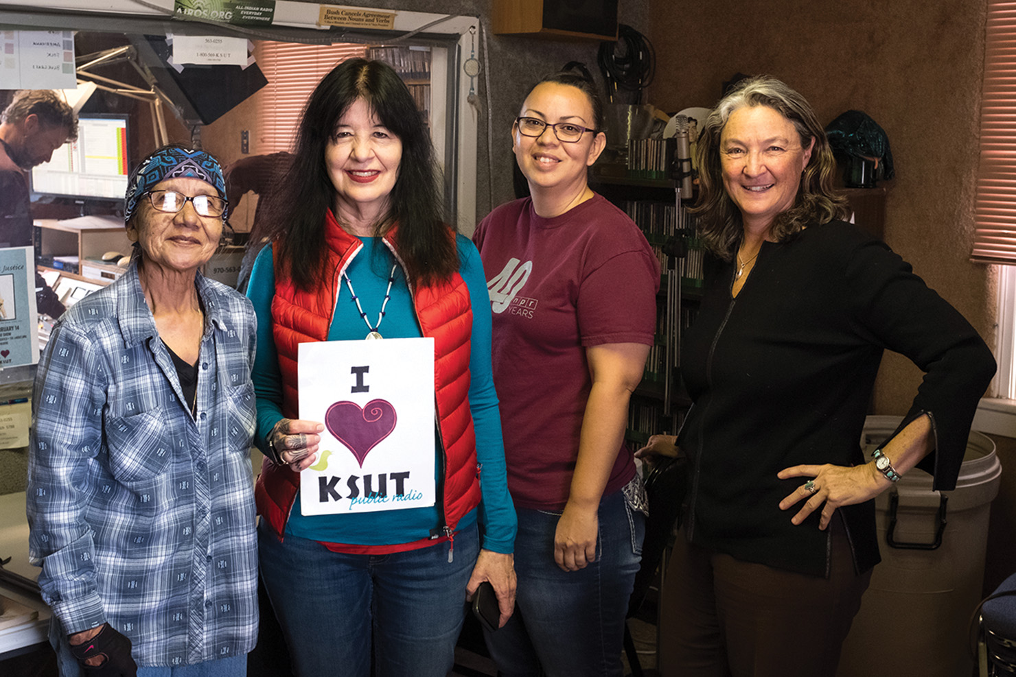 Joy Harjo stands together with Southern Ute tribal elder, Ula Gregory and KSUT directors, Sheila Nanaeto and Tami Graham following a live performance at the KSUT studios on Wednesday, Feb. 14.