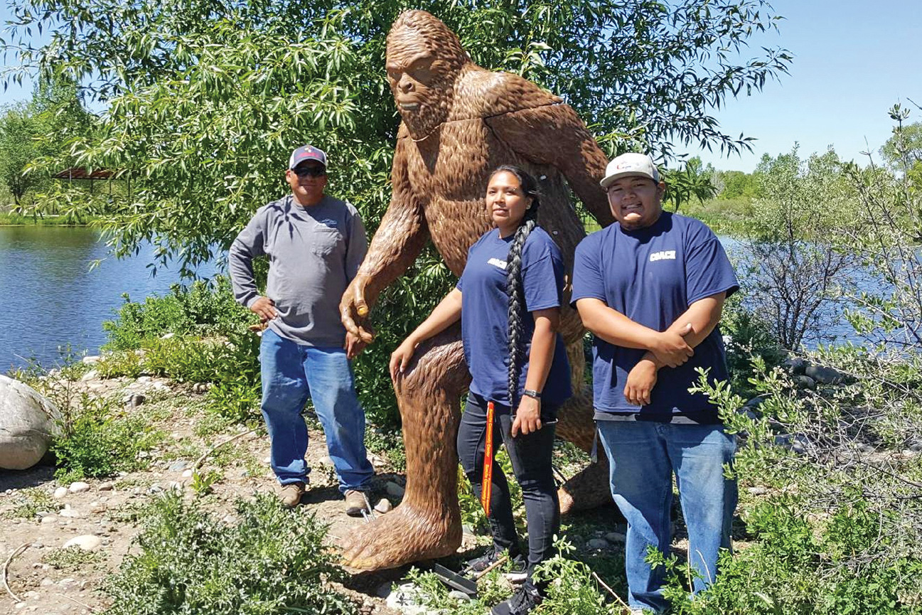 Travis Nanaeto, Krista Richards and Jack Frost III pose with the 3D Sasquatch, which was setup in the middle of Scott’s Pond, for the Tri-Ute archers to shoot at.