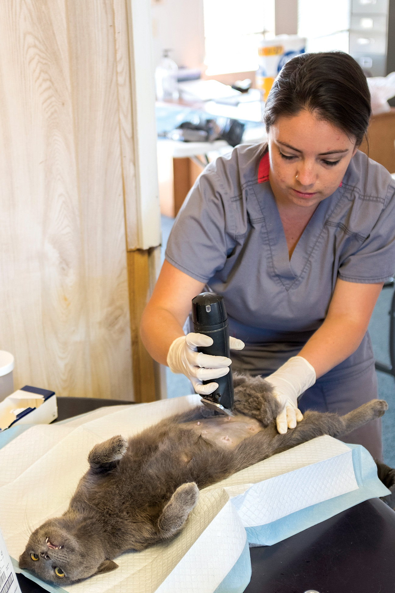 Medical supervisor and veterinary assistant, Tabatha Lansing with the La Plata humane Society preps a young cat for surgery.