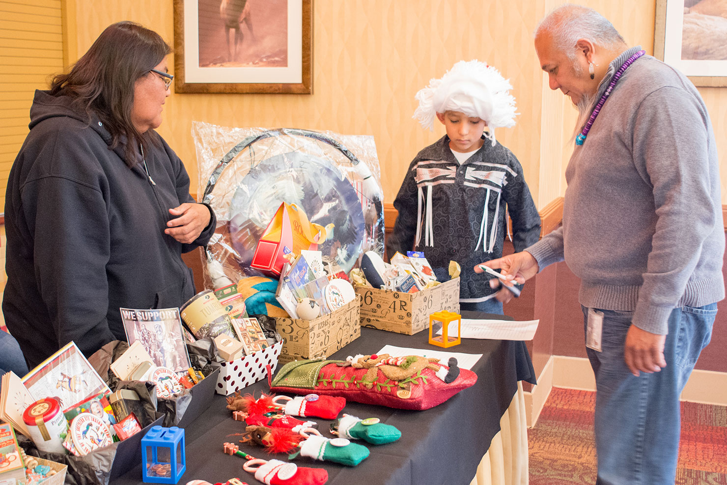 Southern Ute Cultural Preservation Director, Edward Box III places his bid on a cultural basket in the silent auction, put together by a young group of boys who are raising money to attend Space Camp next year.