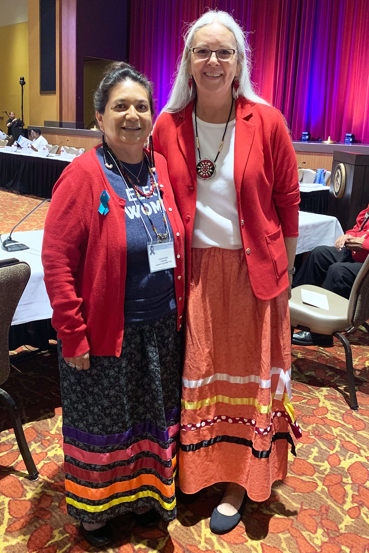 Southern Ute Tribal Chairman, Christine Sage stands with Tribal Councilwoman, Andy Jackson of the Pokagon Band of Potawatomi Indians during a break session of the 14th annual Government to Government Violence Against Women Tribal Consultation on Wednesday, Aug. 21 at the Four Winds Resort in New Buffalo, Mich. The consultation was meant to facilitate an interactive dialogue between Tribal leaders and federal representatives to discuss how to reduce violence against Native American women.