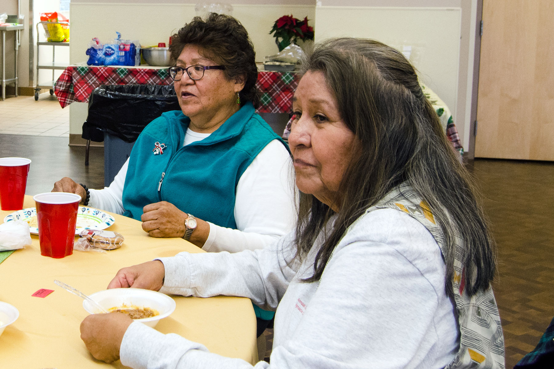 Ramona Eagle and Cynthia Buckskin enjoy a lunch together and watch as the first person of the raffle is chosen.