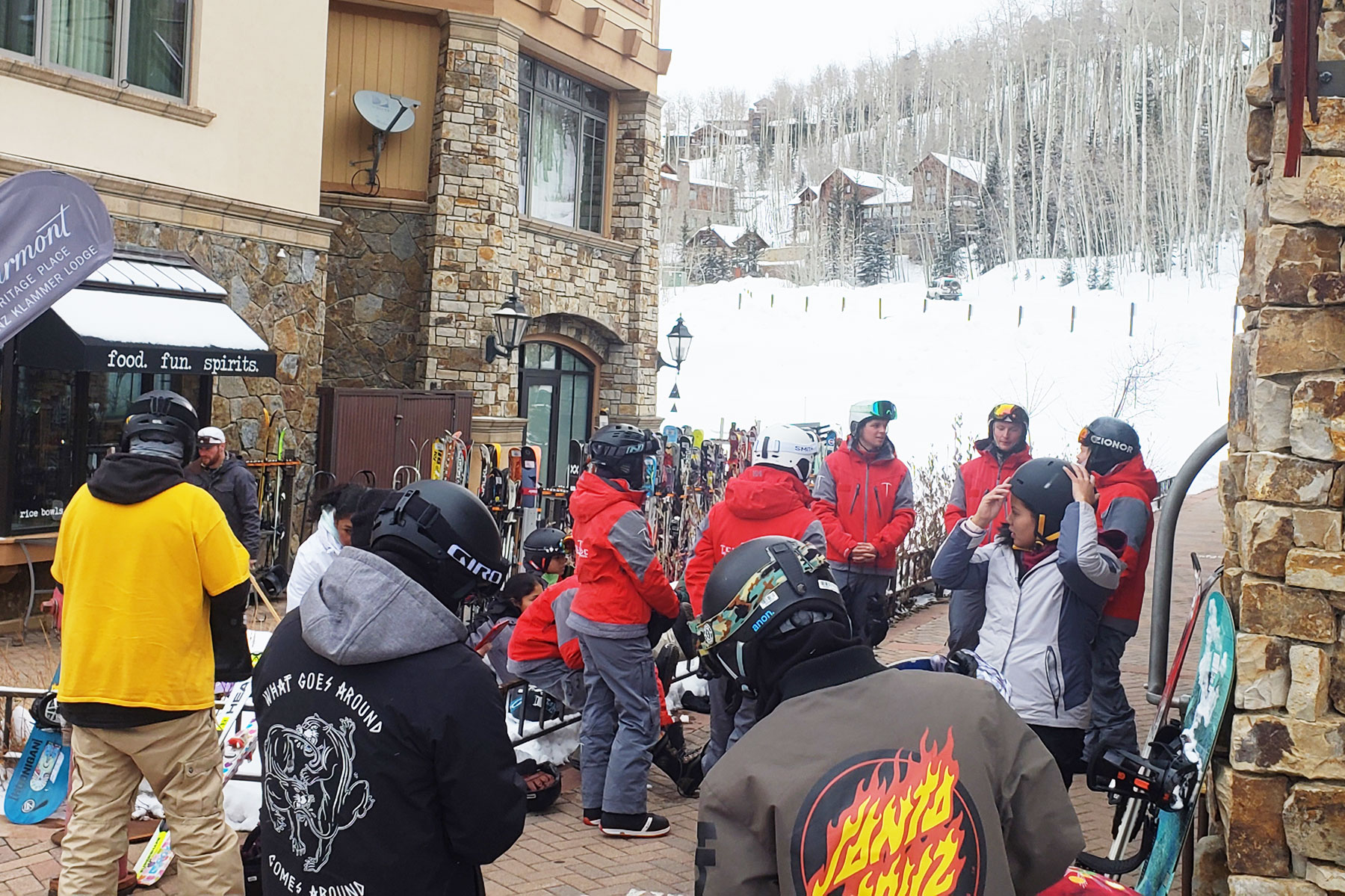 Telluride ski and snowboarding instructors answer the questions of Dewayne Hendren and Sonny Flores after their training sessions are complete.
