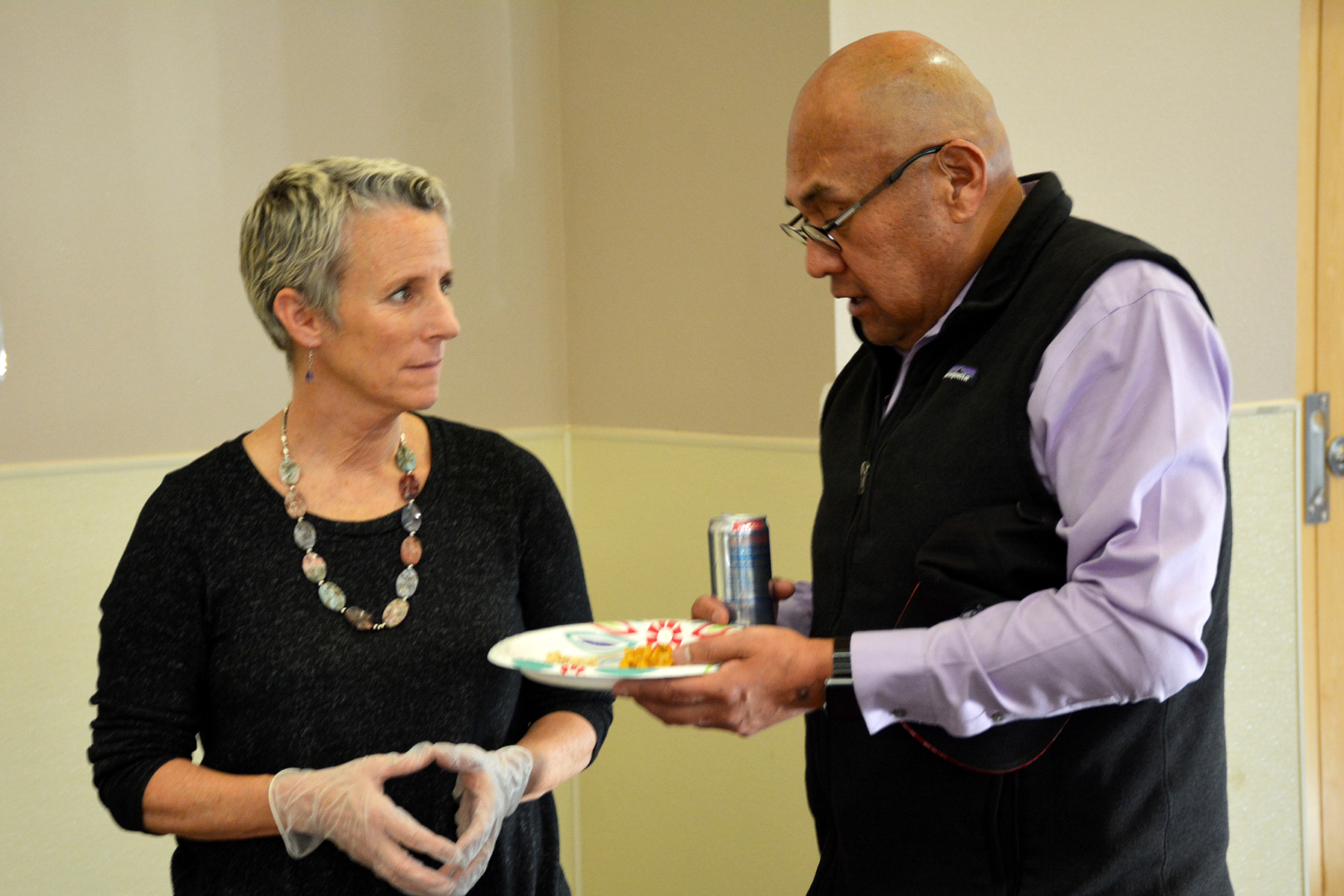 Southern Ute Councilman Bruce Valdez visits with Harold Millich and Lillian Seibel during the monthly Elder Celebration Dinner.