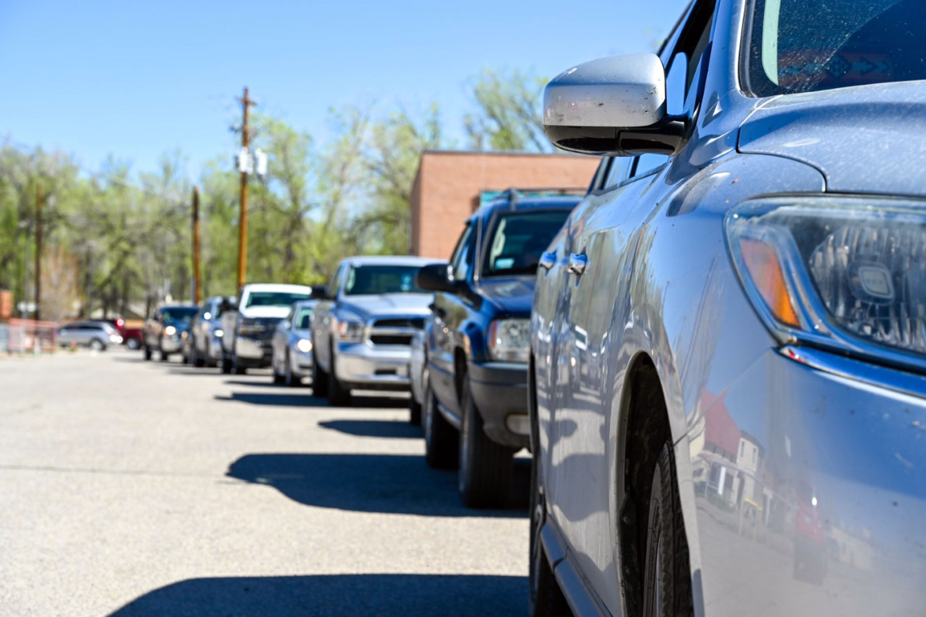 Cars lined up around ELHI Community Center on Saturday, May 2, waiting to get free food and supplies from Ignacio COVID Mutual Aid.