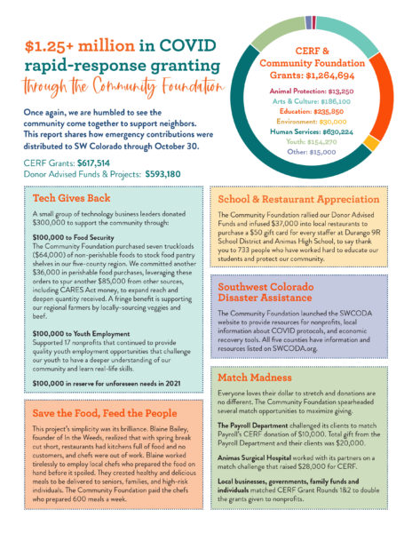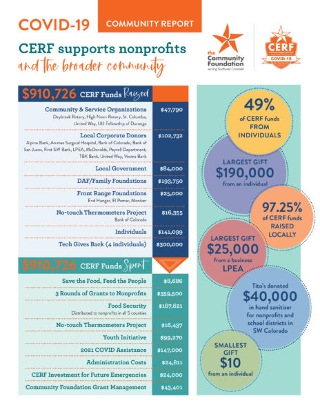 Since the impacts of the pandemic are expected to continue through winter and beyond, $147,000 in CERF funds are earmarked for spending in first quarter of 2021. The CERF fund receives COVID-related emergency donations at coloradogives.org/cerf.