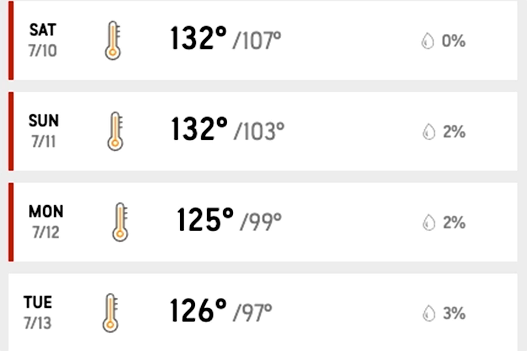 On Friday, the temperature at Death Valley soared to 130 degrees Fahrenheit, breaking the previous daily record high of 129 degrees, according to the National Weather Service (NWS). This mark fell just 4 degrees shy of the highest temperature ever measured on Earth, which was set in Death Valley on July 10, 1913. The mercury then rose to 129 and 128 on Saturday and Sunday, respectively. A normal high at this point in the year is 116. The temperature in Death Valley is averaging over 8 degrees above normal so far this month.