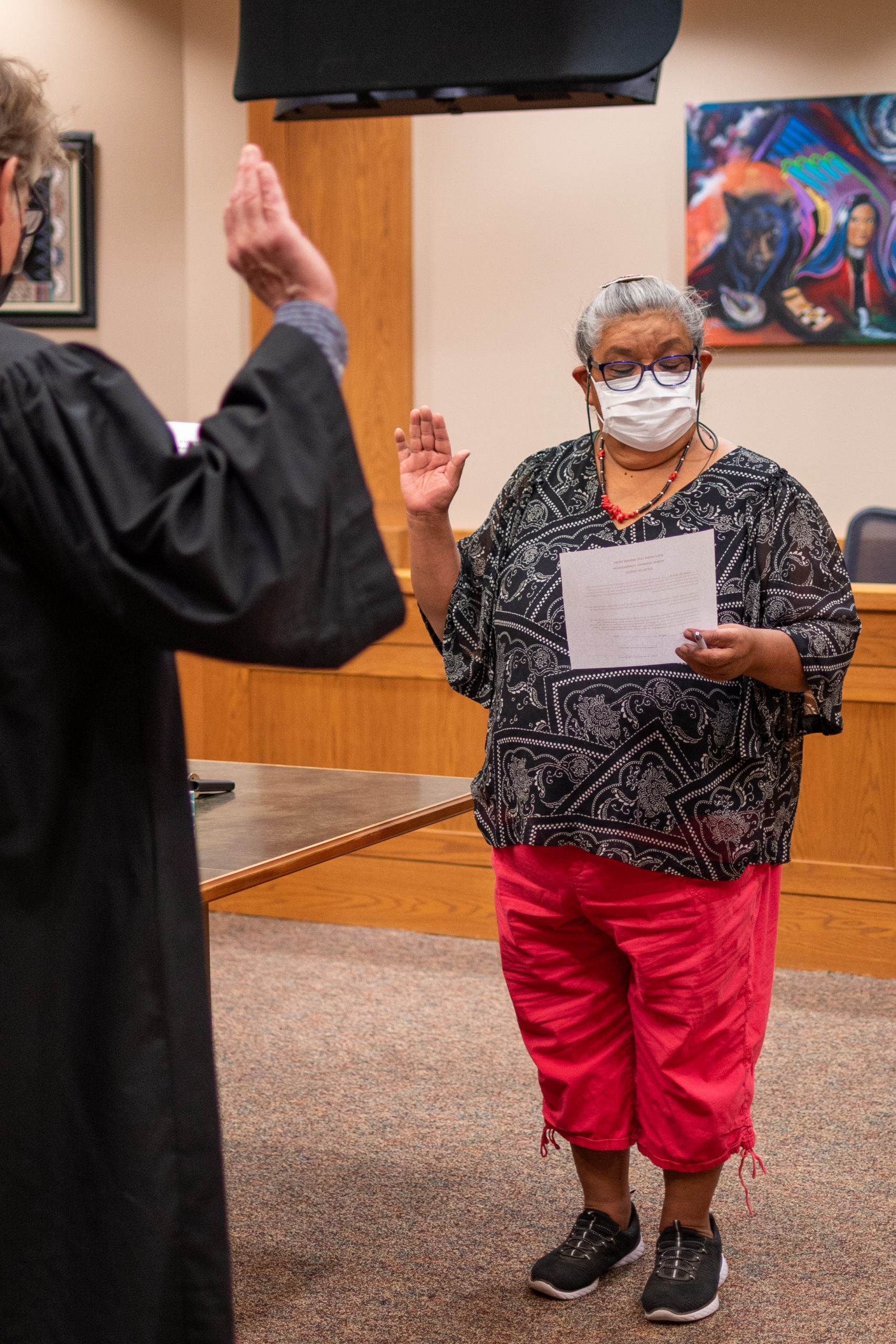 Southern Ute Tribal Court Judge, Paul Whistler swears in Hilda Burch to the Gaming Commission on Wednesday, Sept. 22 in the tribal courthouse.