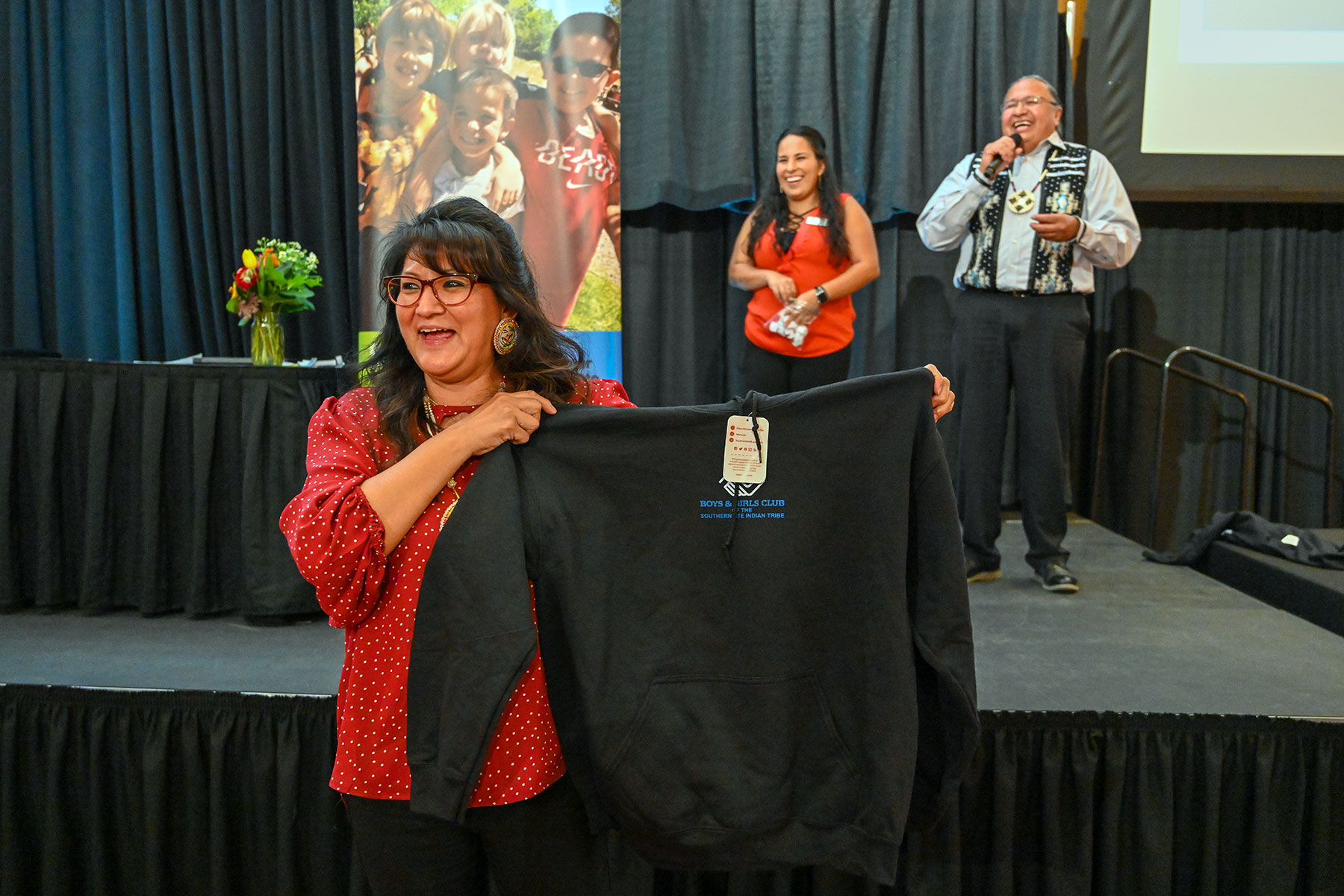 We have a winner! SOuthern Ute Tribal Councilmember Vanessa Torres displays her winning BGC hoodie!