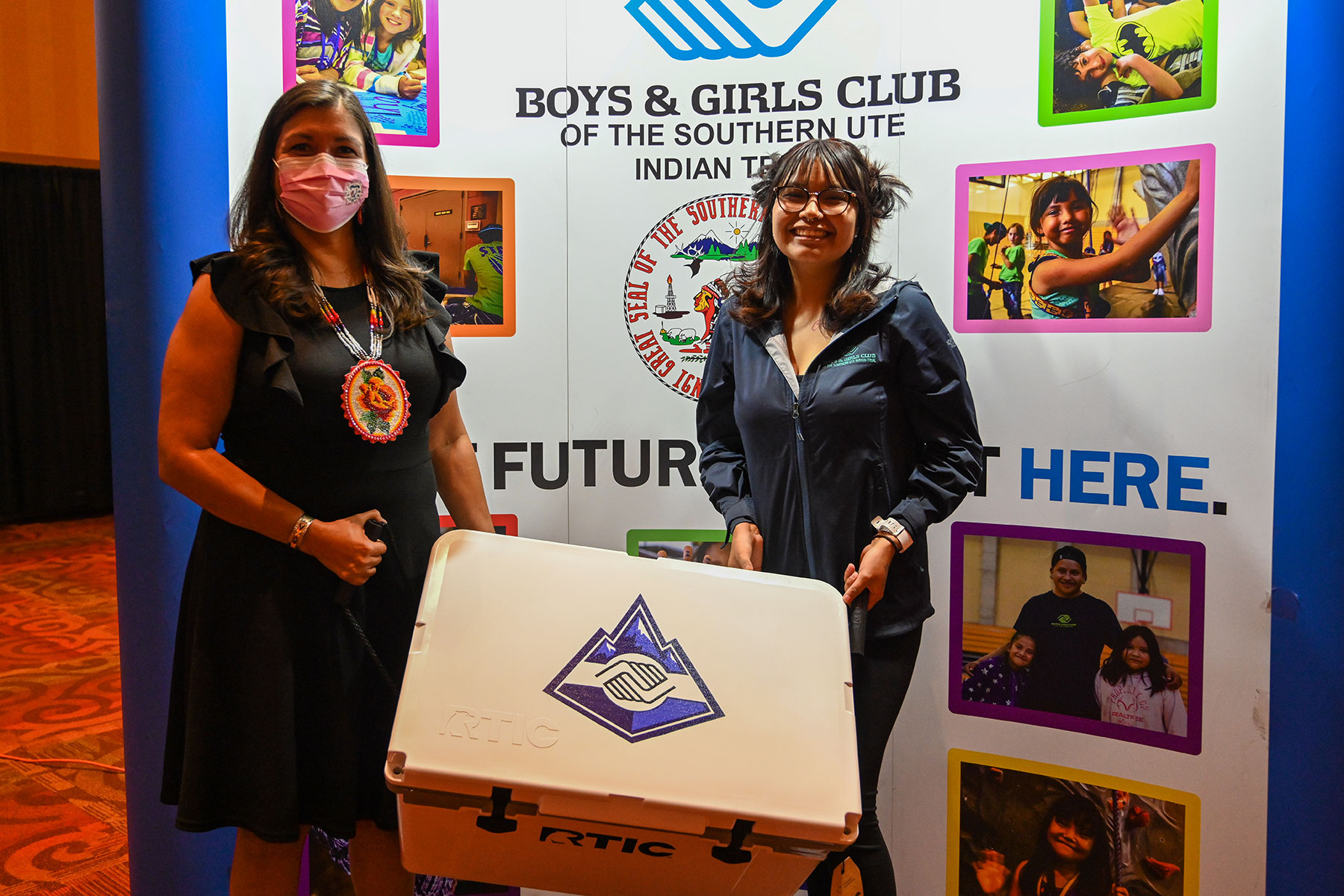 Tribal councilmember Dr. Stacey Oberly shows off the cooler she won during the BGC Building Great Futures Dinner. The sticker on the cooler was designed by Samarah O’John.