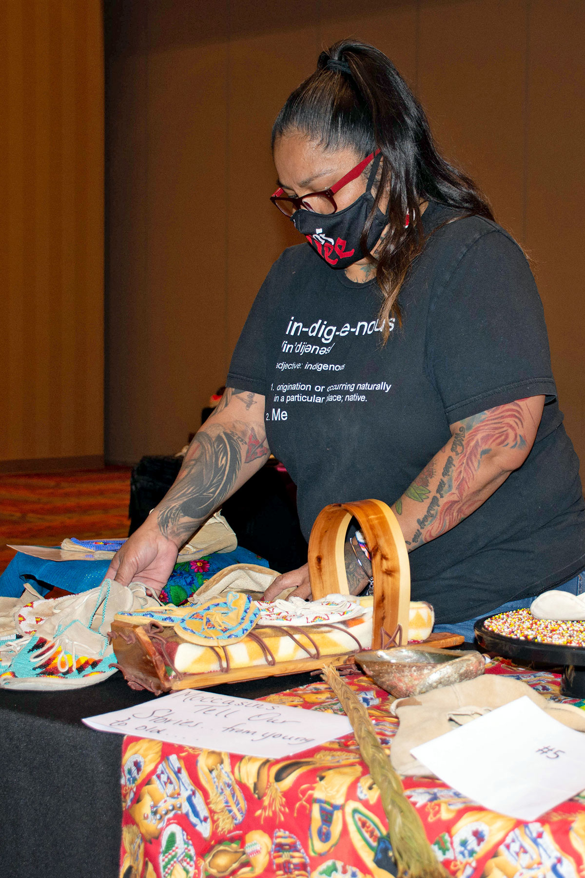 Southern Ute tribal member, Sky Dawn Moccasin sets up her display of moccasins from her family personal collection. She displayed family moccasins and heirlooms. Sky Dawn won first place in both the Adult Single Pair and Adult Native Display.