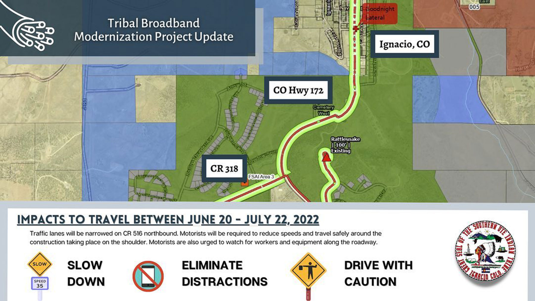 Project News: Bonfire Engineering will begin construction on CO Highway 172 going into the Town of lgnacio as outlined in Phase I of the tribal broadband project. Construction will take place along CO Highway 172 at the intersection of CR 318 going north along CO Highway 172 into the Town of lgnacio, ending at the intersection of CR 517.