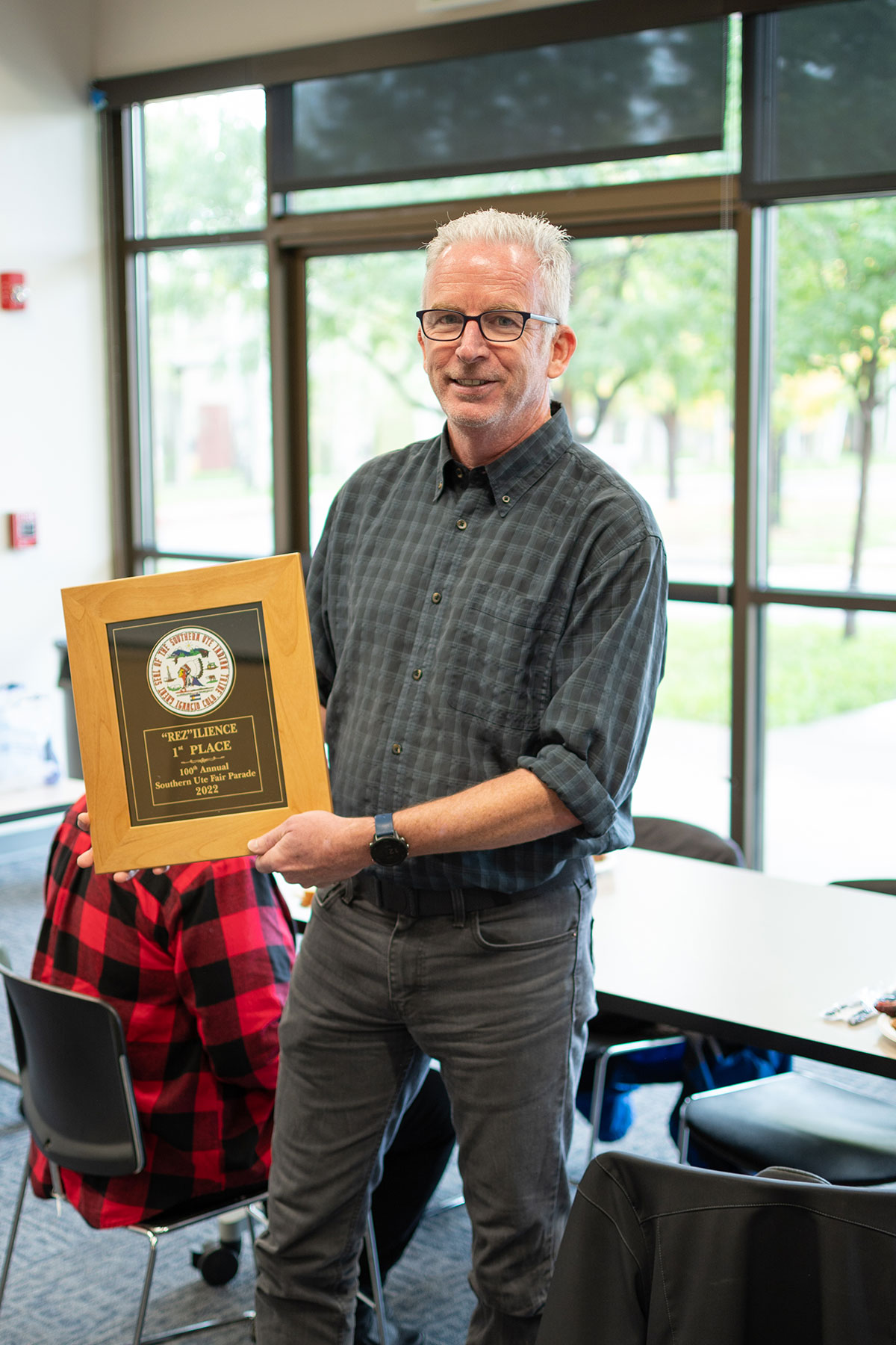 Wildlife Division Head Steve Whiteman proudly holds the first-place Executive Office award during the celebratory luncheon for the Division of Natural Resources (DNR) on Thursday, Sept. 22 at the SunUte Community Center. During the 100th Annual Southern Ute Fair Parade all Permanent Fund departments that participated in this year’s parade were judged for an award given by Executive Officer James “Mike” Olguin. The winners of the Executive Office award were selected based on float design, detail, float assembly and parade participation.