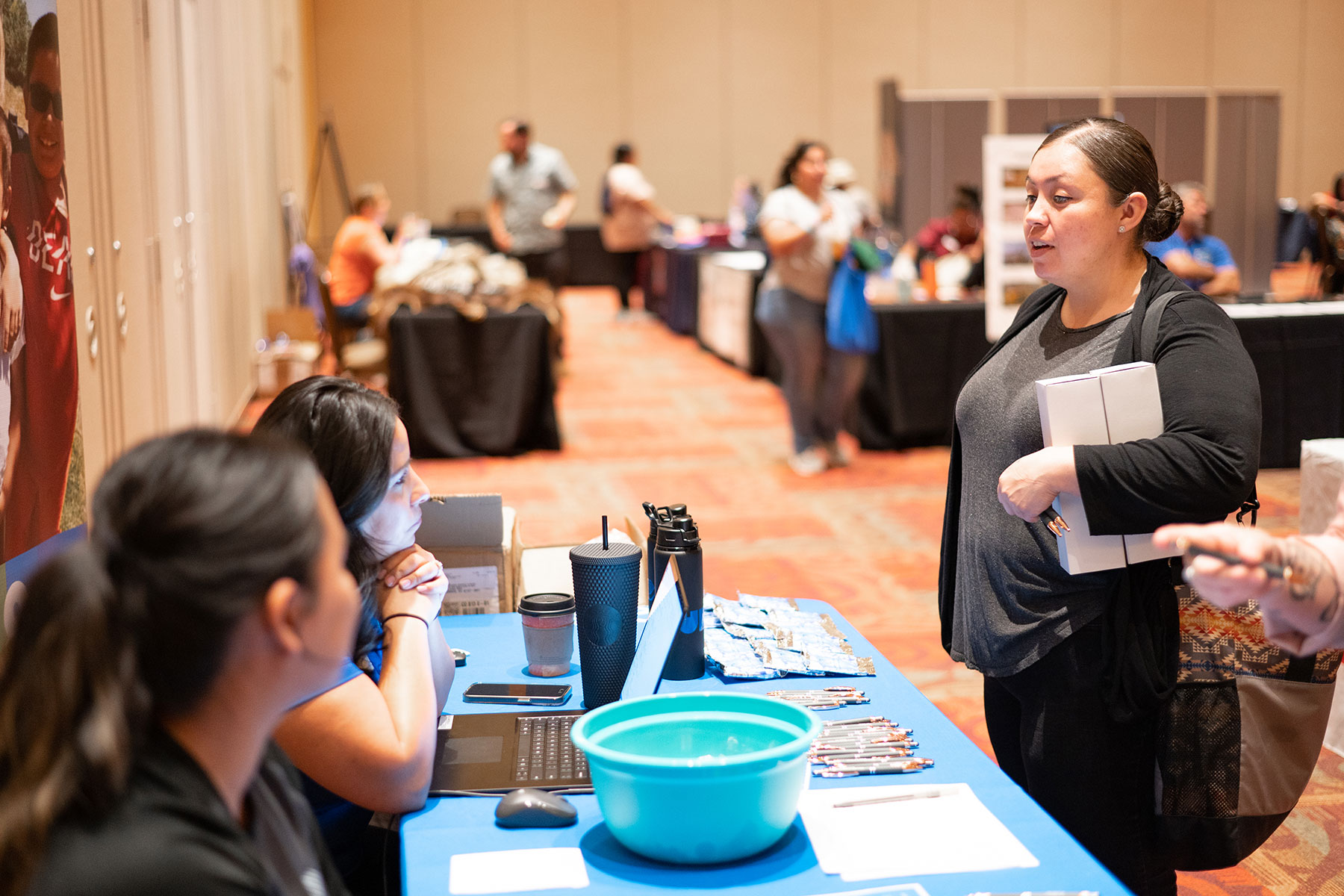 The Southern Ute Human Resources Department hosts the Southern Ute Tribal Member Career Fair on Tuesday, May 9 at the Sky Ute Casino Event Center. The event welcomed Southern Ute tribal members to visit and speak with departments and divisions within the Permanent Fund, as well as Sky Ute Casino and Growth Fund entities. Tribal member Shailyn Olguin visits Nicole Black at the Southern Ute Wildlife Division booth during the event.