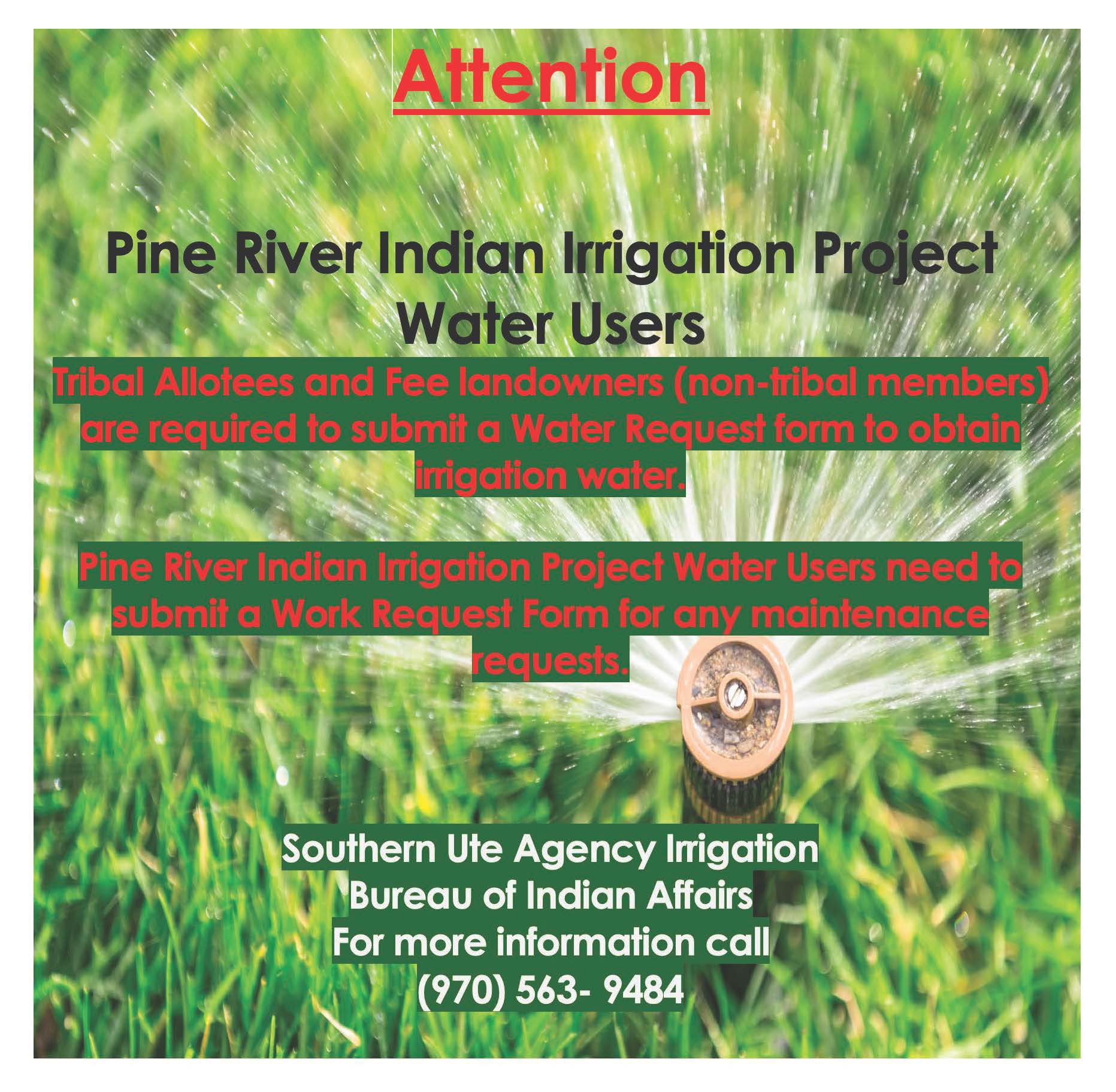 Tribal Allotees and Fee landowners (non-tribal members) are required to submit a Water Request form to obtain irrigation water.