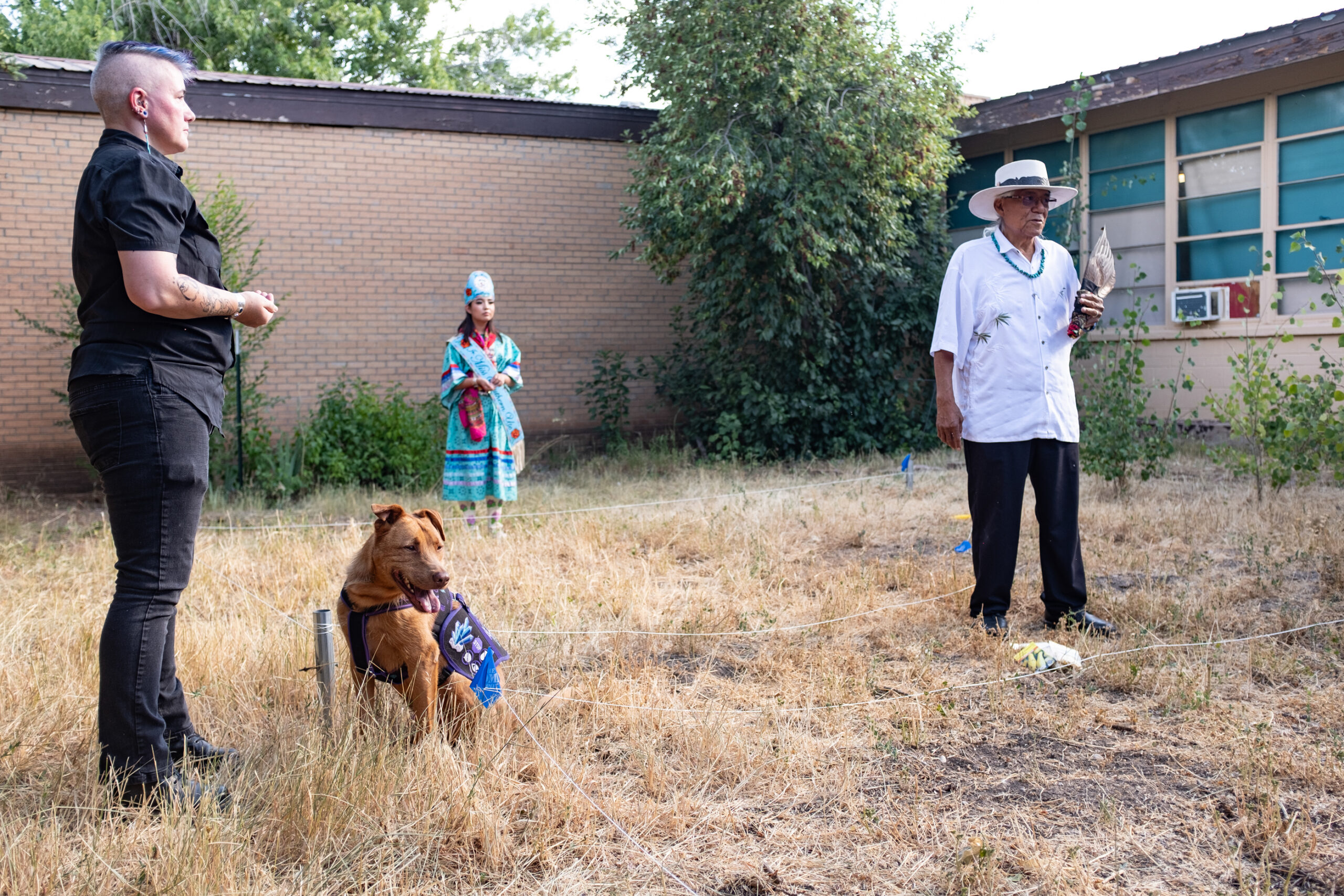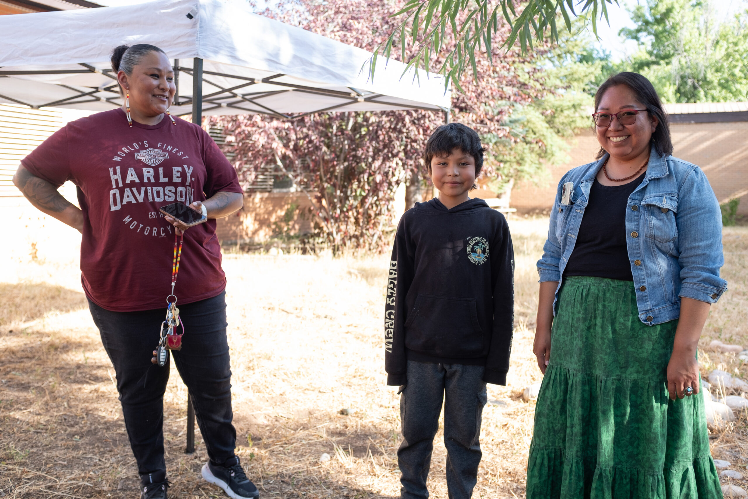 Native Love’s Daisy Bluestar (left), and son Andre Bluestar-Baker (center), and Sexual Assault Services Organization (SASO) Director, Kelsey Lansing visit with each other during the land blessing event at the ELHI Community Center, Monday, July 24.