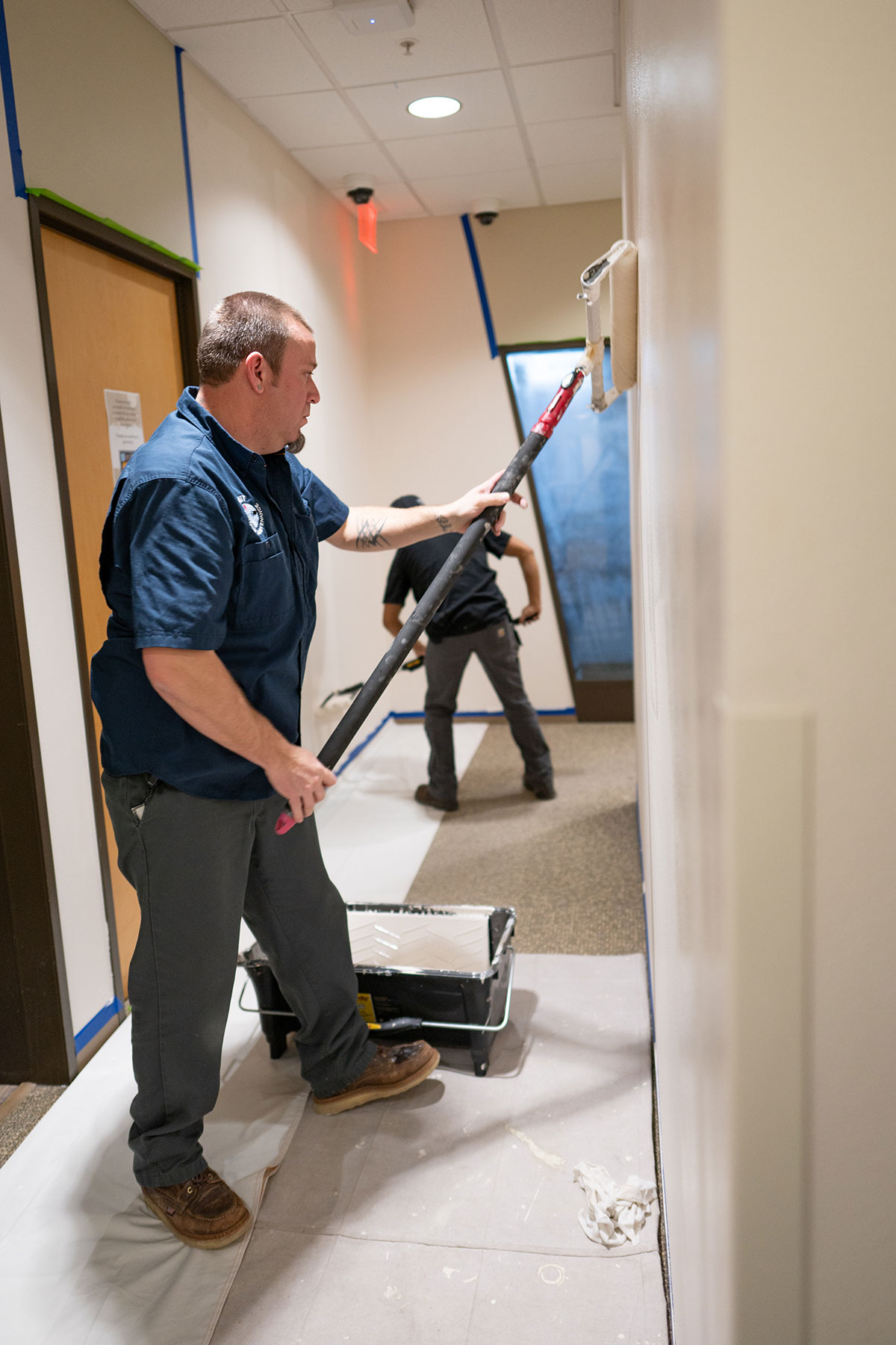 Technician Jeremy Barber rolls fresh paint onto the walls in the Tribal Council office space, crews work to improve the halls of the Leonard C. Burch Administrative Building. Cosmetic improvements include new paint, appliances, and minor repairs throughout the building.