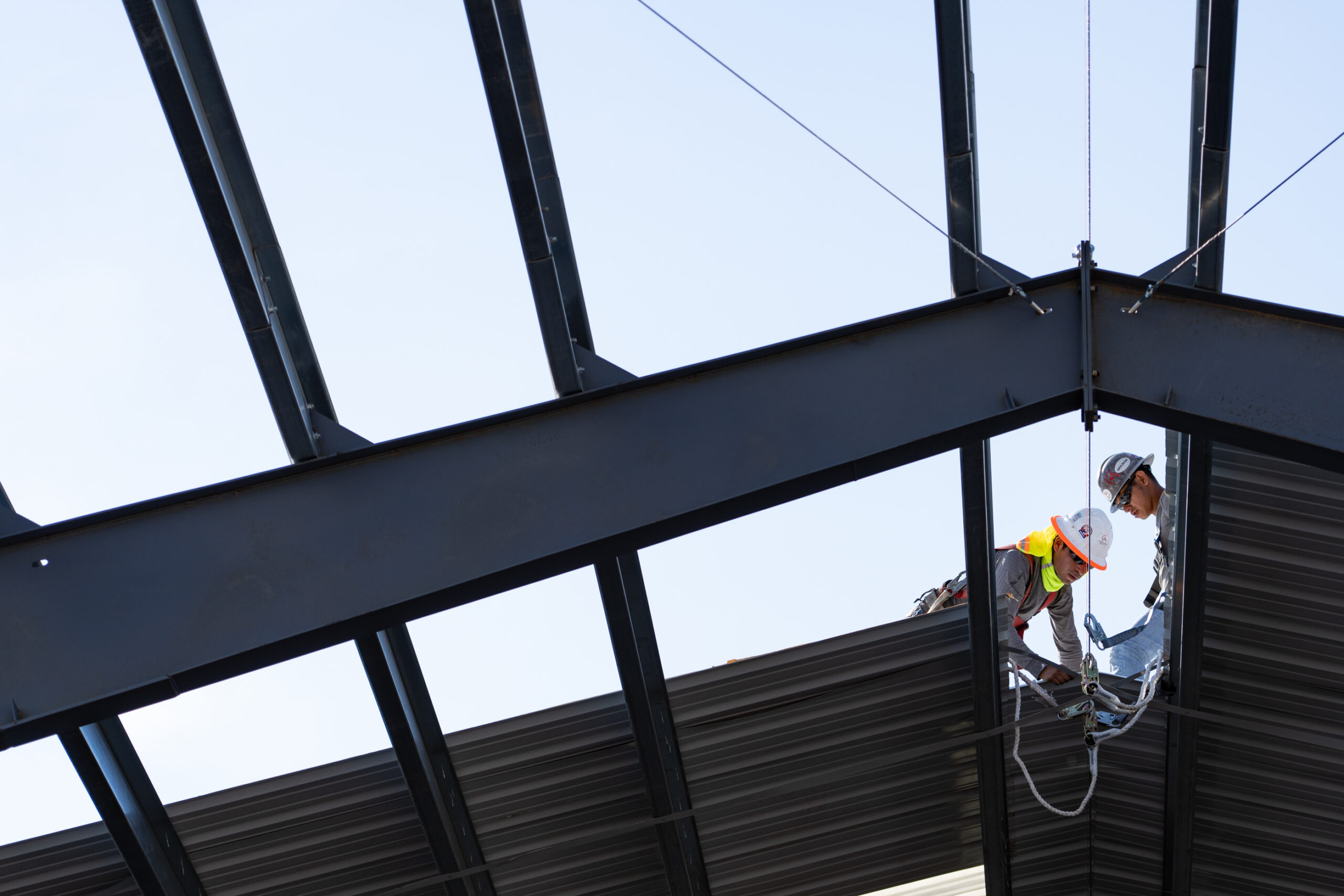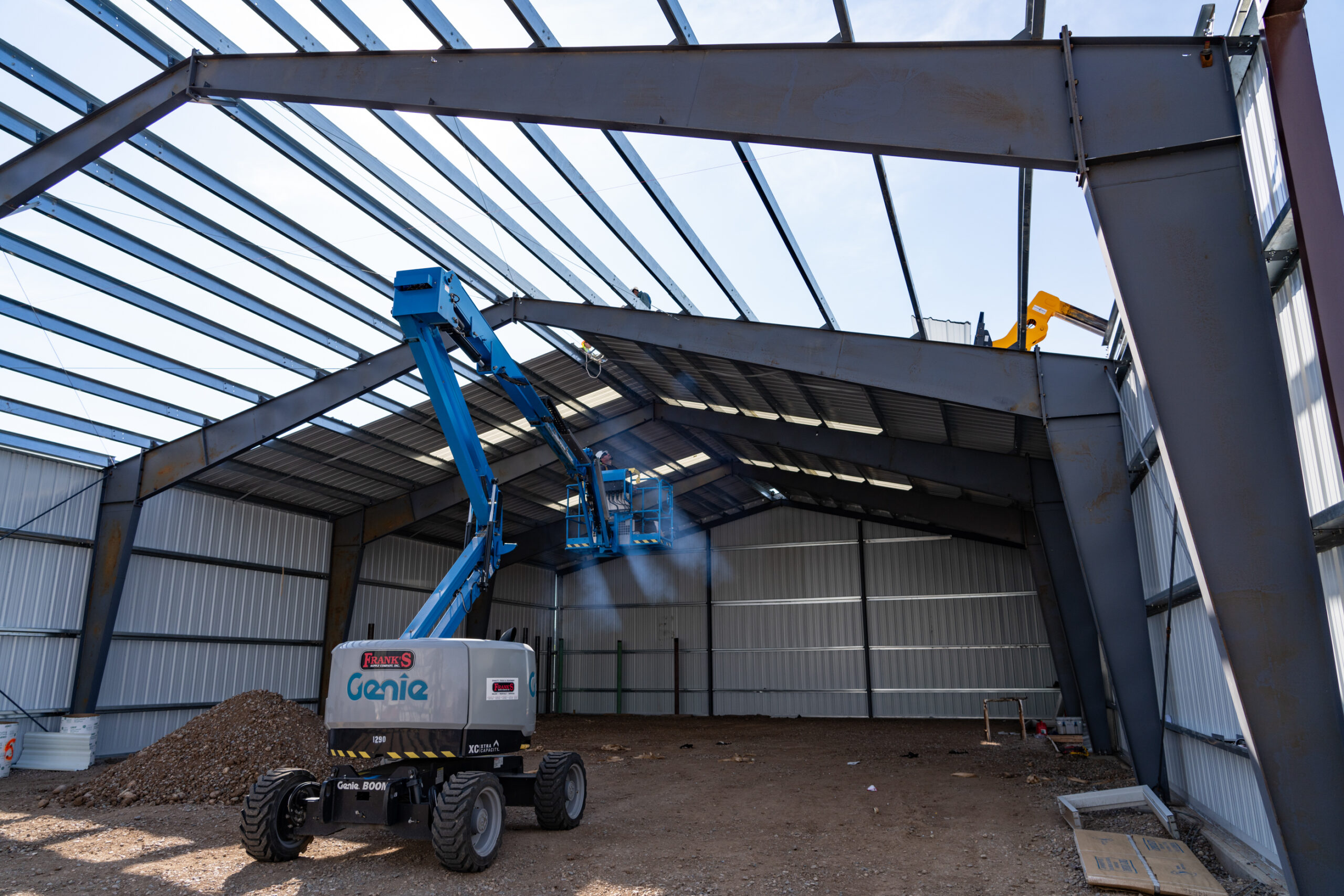 Contractors with Crossfire LLC work to place roof panels on the new metal storage building at Southern Ute Agricultural Division, Tuesday, July 16.