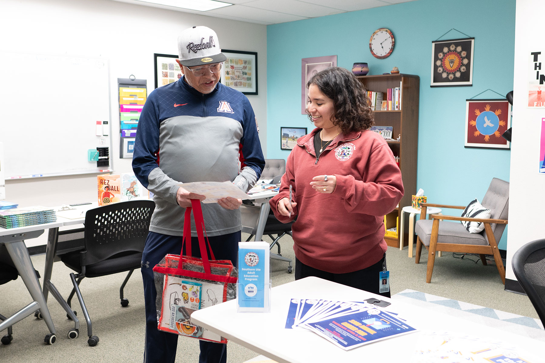 Adult Education Program Specialist, Andrea Schultz signs off on scavenger hunt cards during the Southern Ute Education Open House event on Wednesday, Oct. 9. Families gathered to meet the staff, enjoy a meal, and enter a scavenger hunt for door prizes.