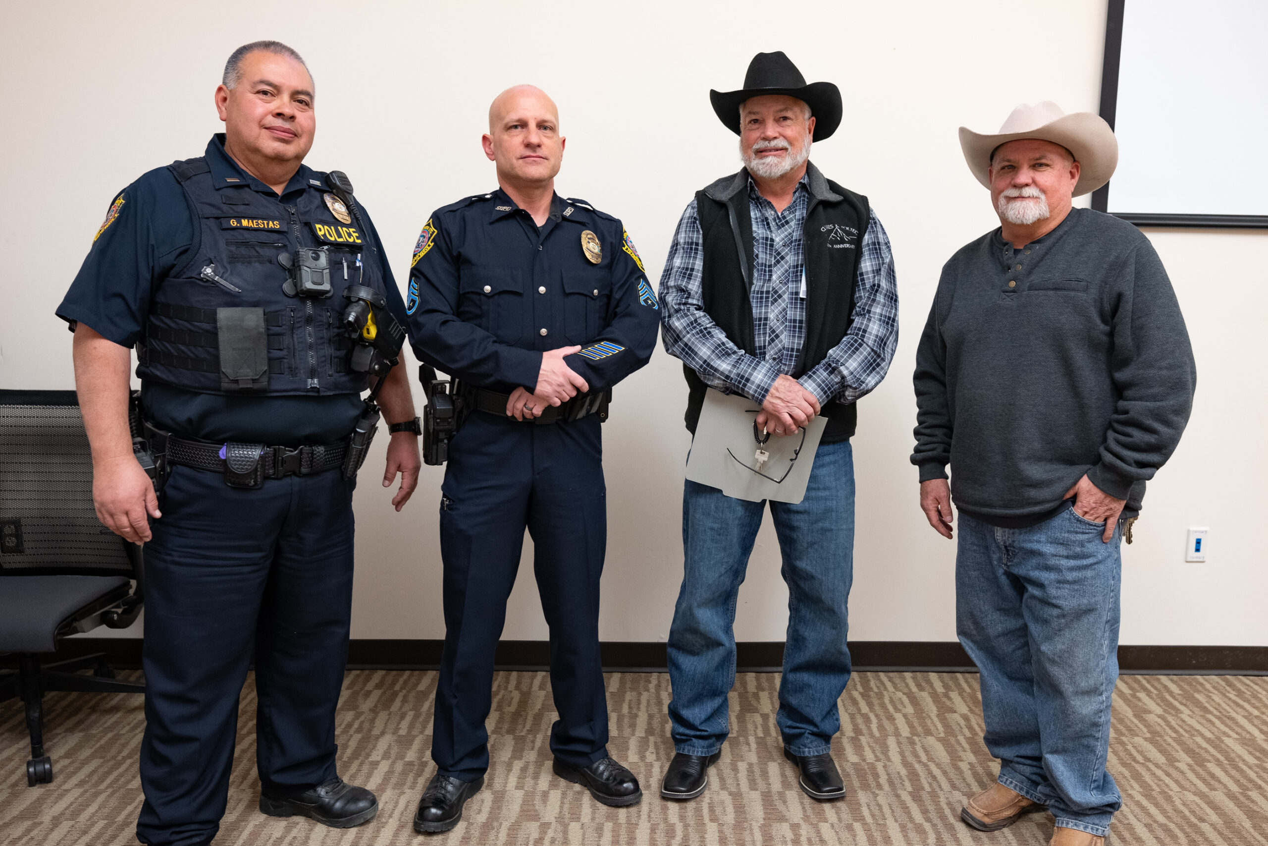 Justice & Regulatory invited fellow law enforcement officers and family to a small promotion party for Brandon Henderson, who was recently promoted to the rank of sergeant. Pictured left to right: SUPD Police Lieutenant, Gary Maestas; SUPD Sergeant Brandon Henderson, J&R Director Elliott Salazar; and Head of Detention, DeWayne Todd; who congratulated him in his new position, Wednesday, Dec. 11.