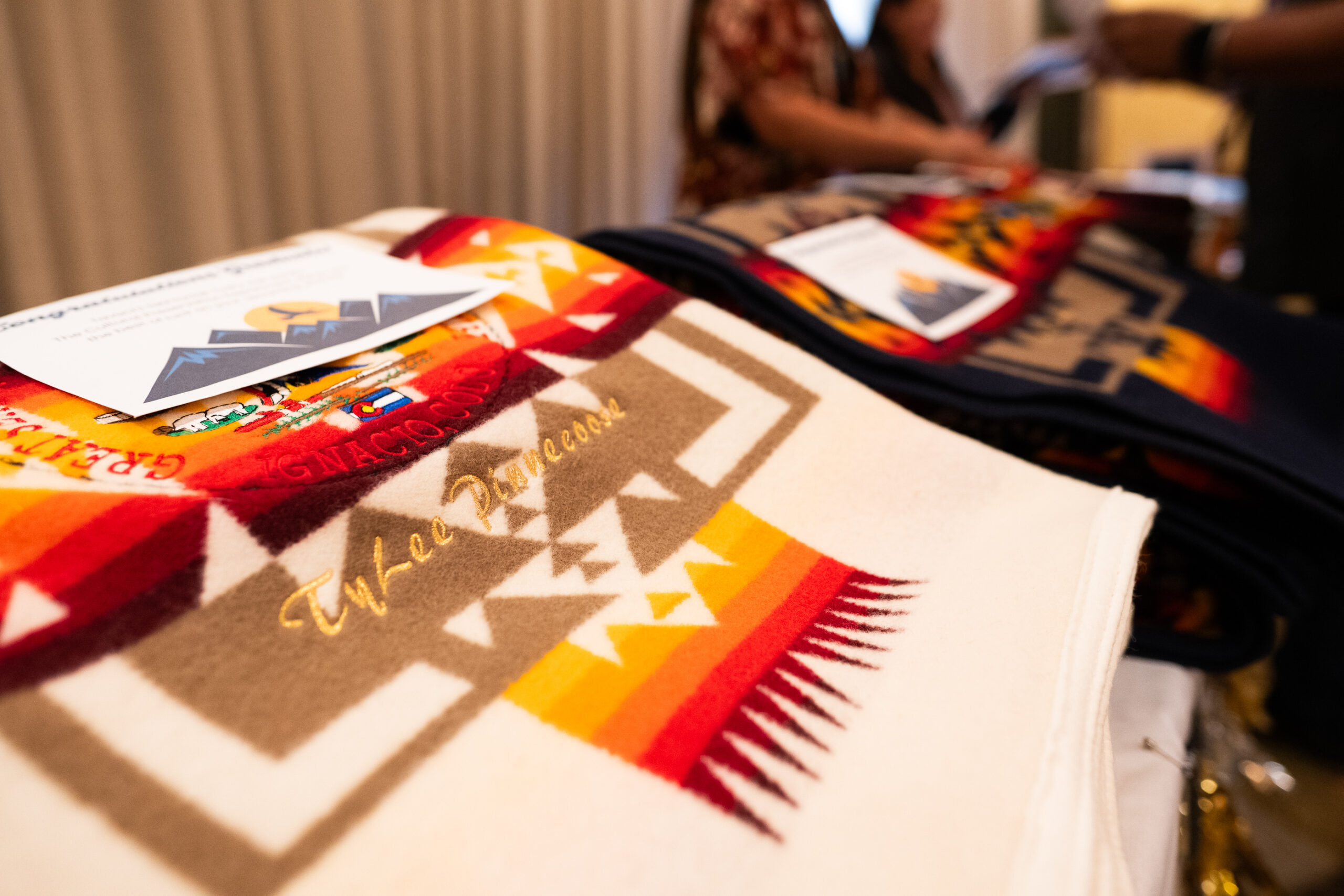Southern Ute tribal students and Johnson-O'Malley students who have recently graduated, receive embroidered Pendleton blankets, celebratory cards, and some students receive plaques in recognition of their academic achievements.