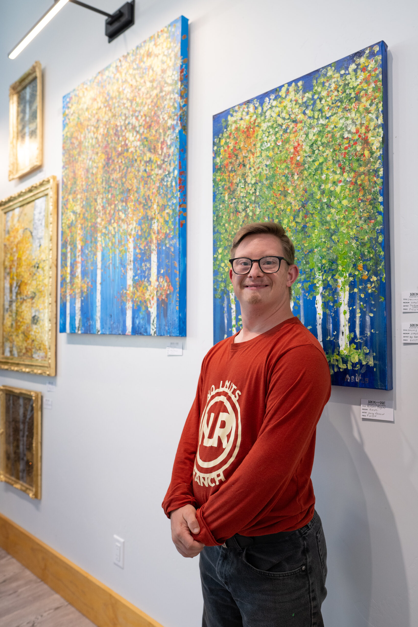 Andy Arnold utilizes the finger-painting technique to create vibrant Aspen trees. His canvases, watercolor cards, and prints are available for purchase at the Dancing Spirit Center for the Arts.