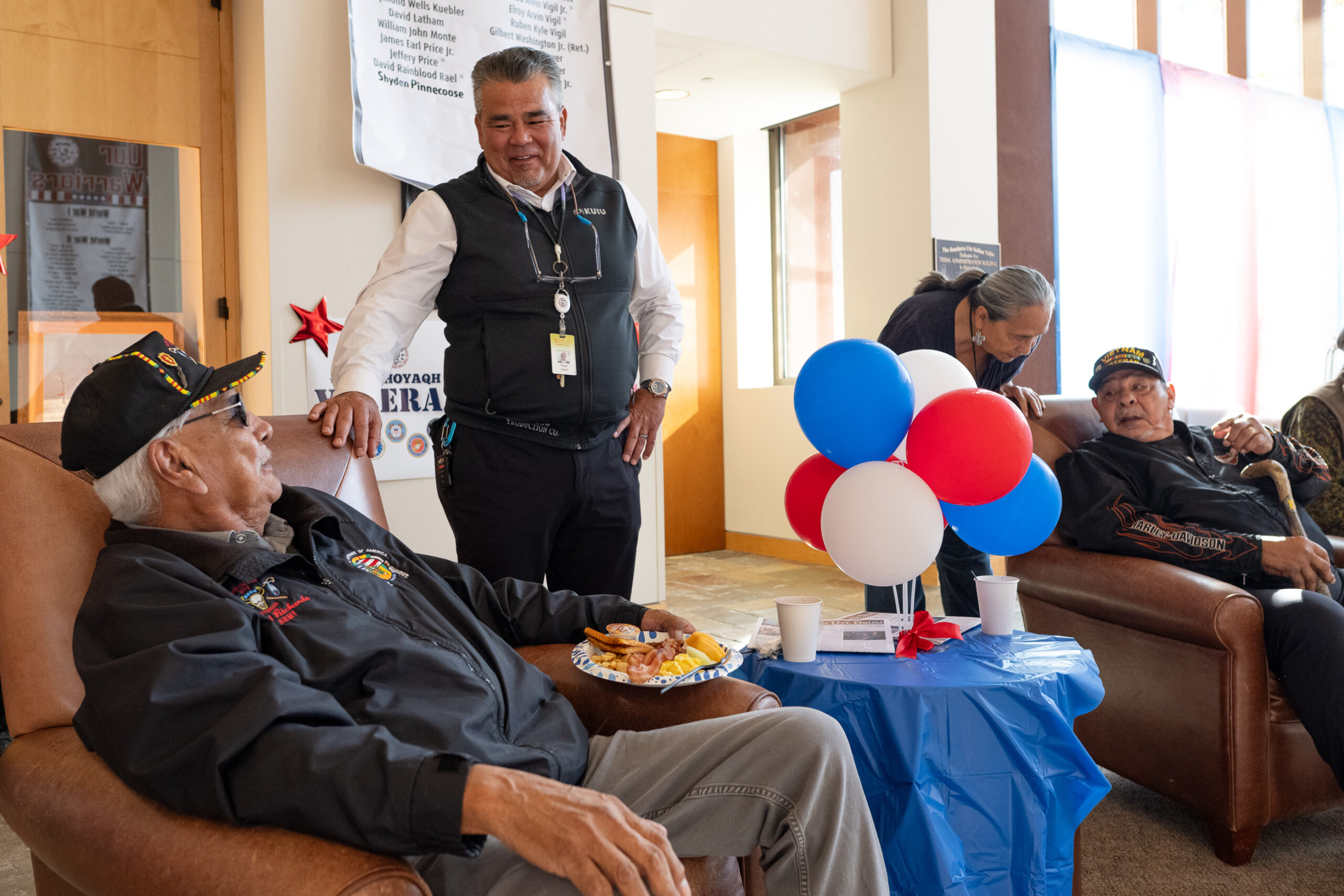 Shane Seibel greets Howard Richards Sr. during the free breakfast event on Thursday, Nov. 6 in the Hall of Warriors, tribal employees gathered to also show their appreciation for veterans during the event.
