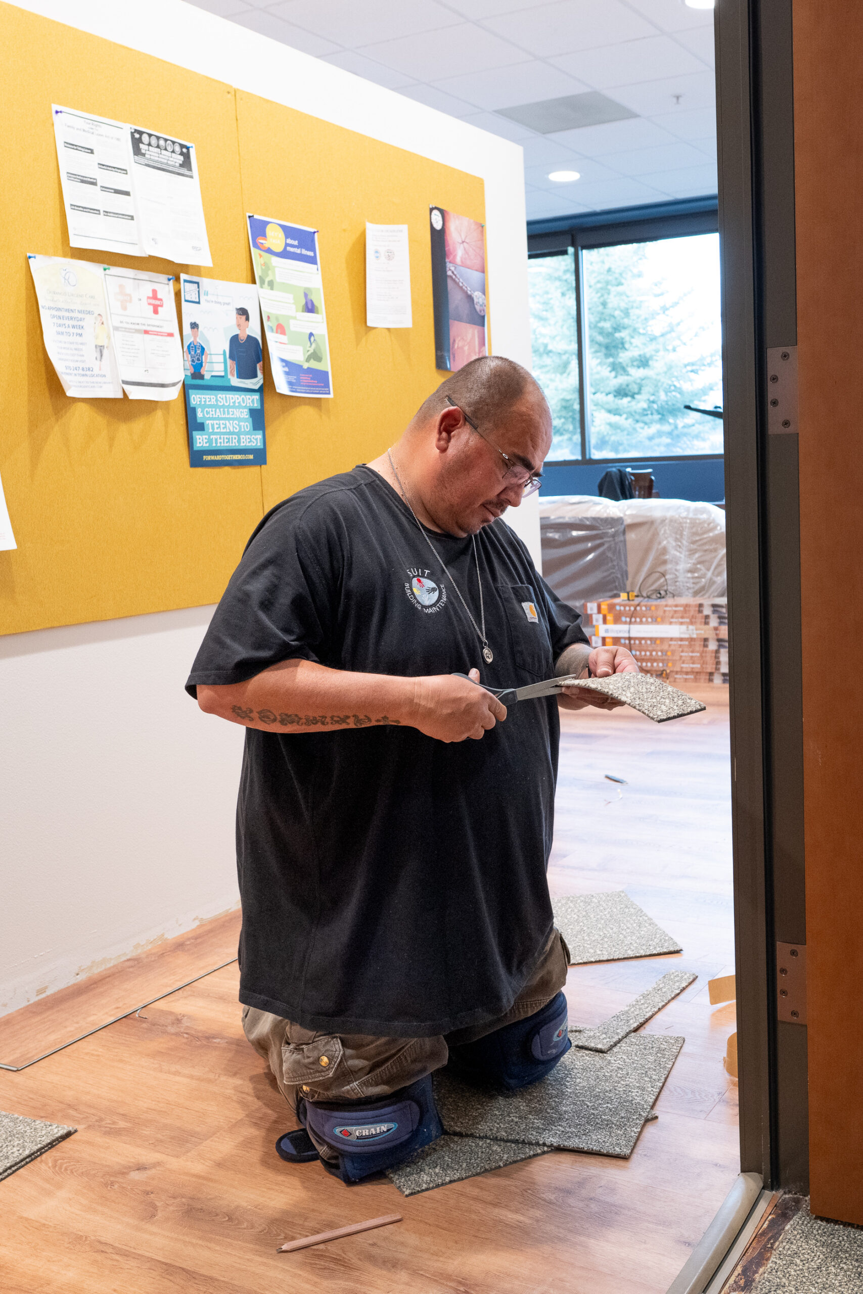 Southern Ute Building Maintenance worked diligently to remodel flooring, wall paint and replace furniture to the Sunshine Cloud Smith Room located on the second floor of the Leonard C. Burch Building. Gabe Archuleta cuts flooring pieces for the entry to the breakroom on Tuesday, Nov. 18.