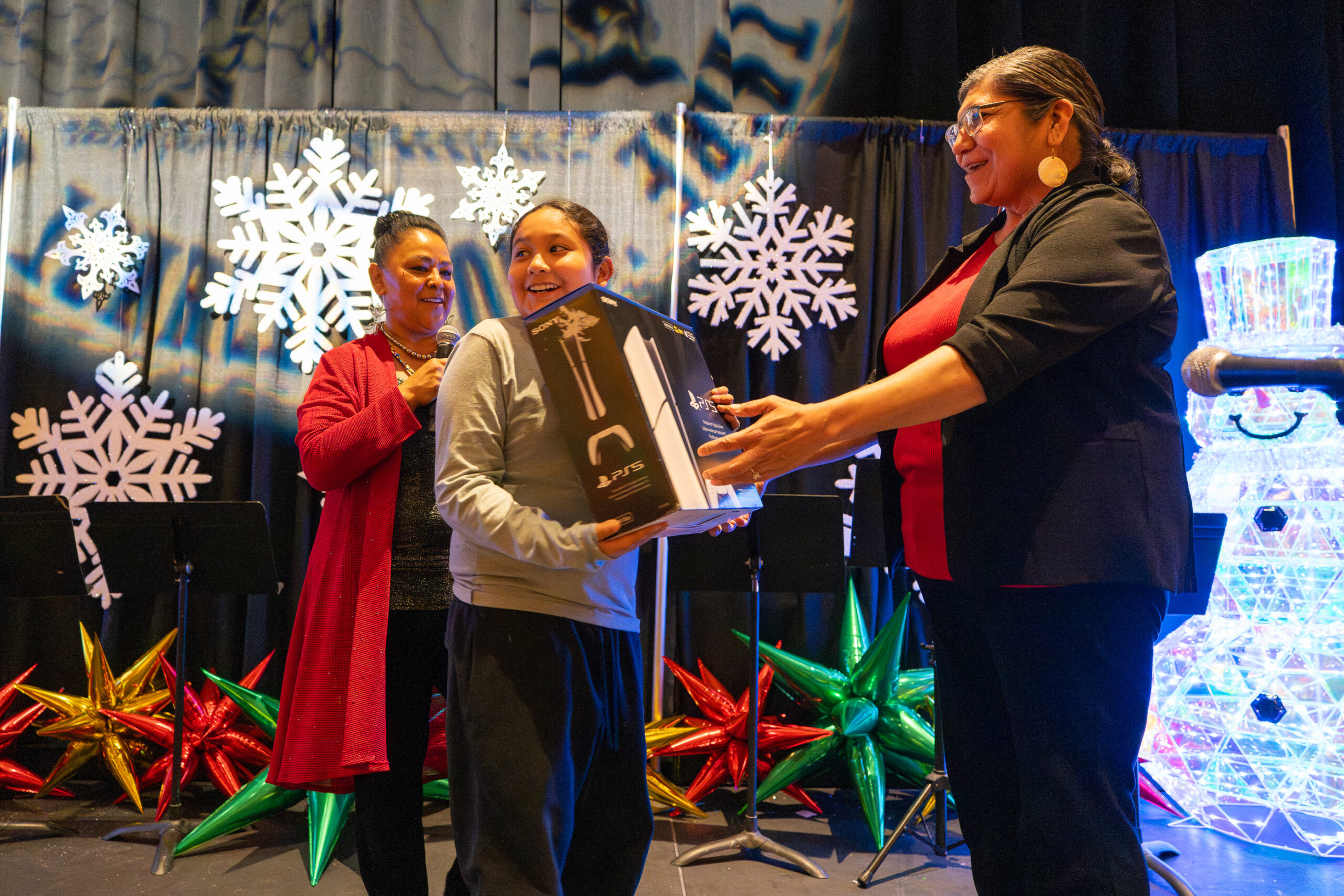 Smiles were in abundance as Ute relatives got together to celebrate the upcoming holidays and share a meal, Saturday, Dec. 13. at the Southern Ute Indian Tribe’s annual Christmas Dinner and Program held at the Sky Ute Casino Resort. Christmas music provided by Sandman and Hummingbird Productions set the tone as gifts were shared in celebration. Families enjoyed a prime rib meal with various desserts to choose from ahead of the Christmas Program opened by Southern Ute Royalty, giving the Lord’s Prayer in sign language.