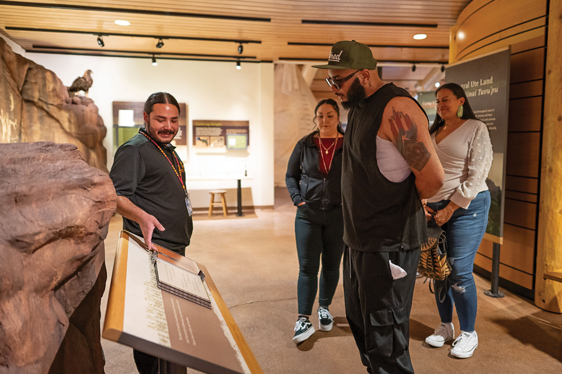 Museum Director, Fabian Martinez and SUCCM Business Manager, Samantha Maez gave a tour of the permanent and temporary galleries to artist Chi King during his visit to the Reservation ahead of King’s upcoming music video production. King learned about the history of the Ute people, Southern Ute boarding school era, modern life, Southern Ute veterans, and more during his visit.