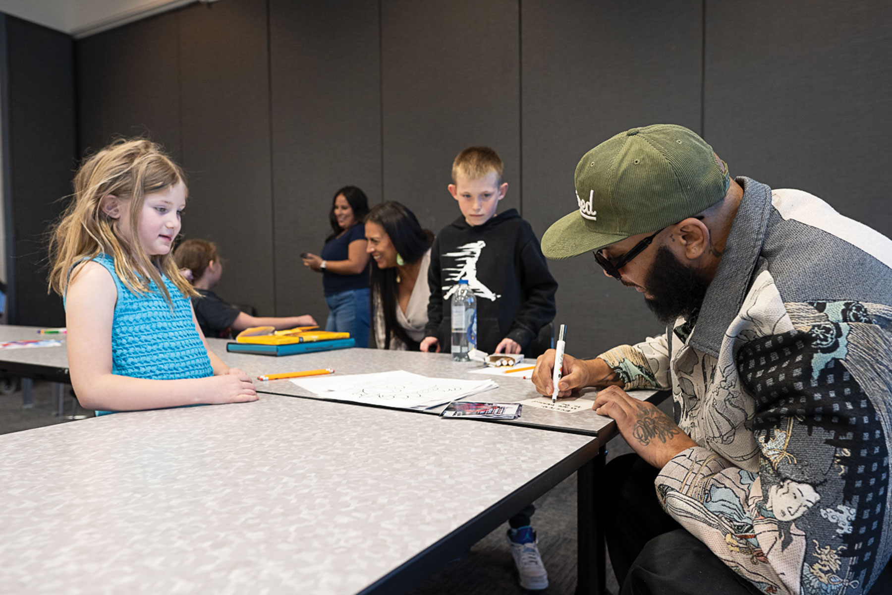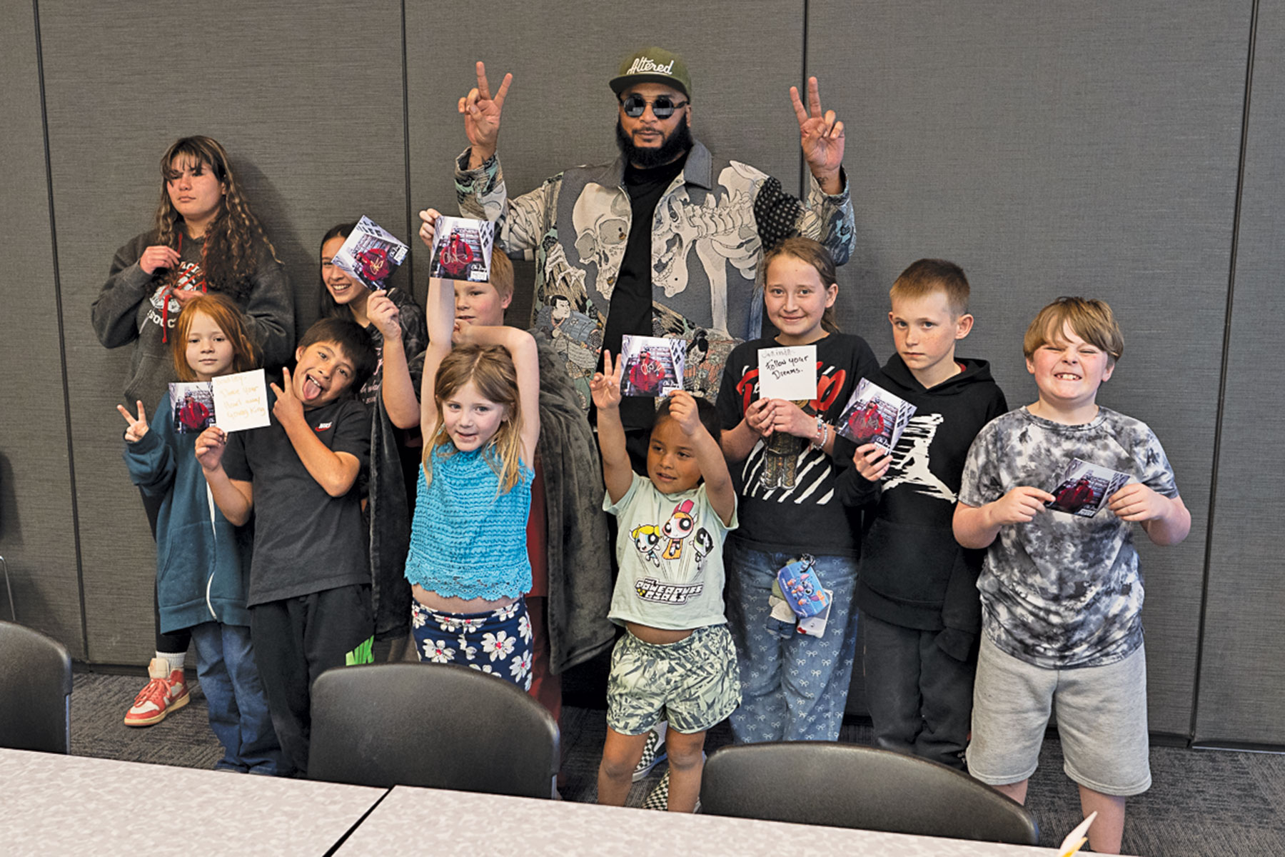 Musician Chi King, visits with club members of the Boys and Girls Club at SunUte Community Center on Tuesday, March 17. King gave autographs to each member during his visit where he shared details of the music he makes and gave a motivational speech to the youth