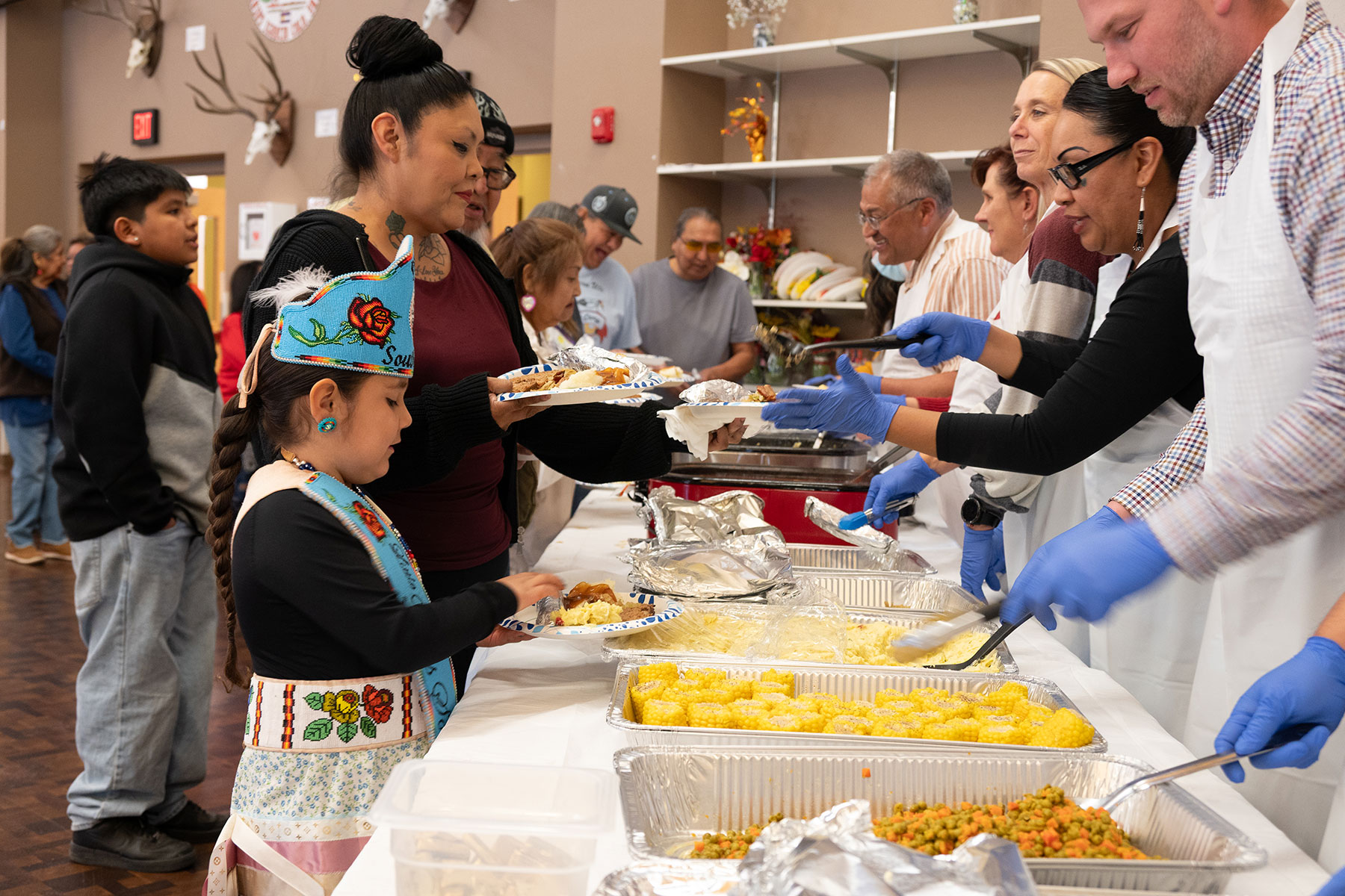 Career Coordinator, Rochelle Aguilar of the Southern Ute Human Resources Dept. serves stewed cabbage with bacon to Emily Whiteman with other Human Resources staff members, including Michelle Wagner and Mary Gwinn.