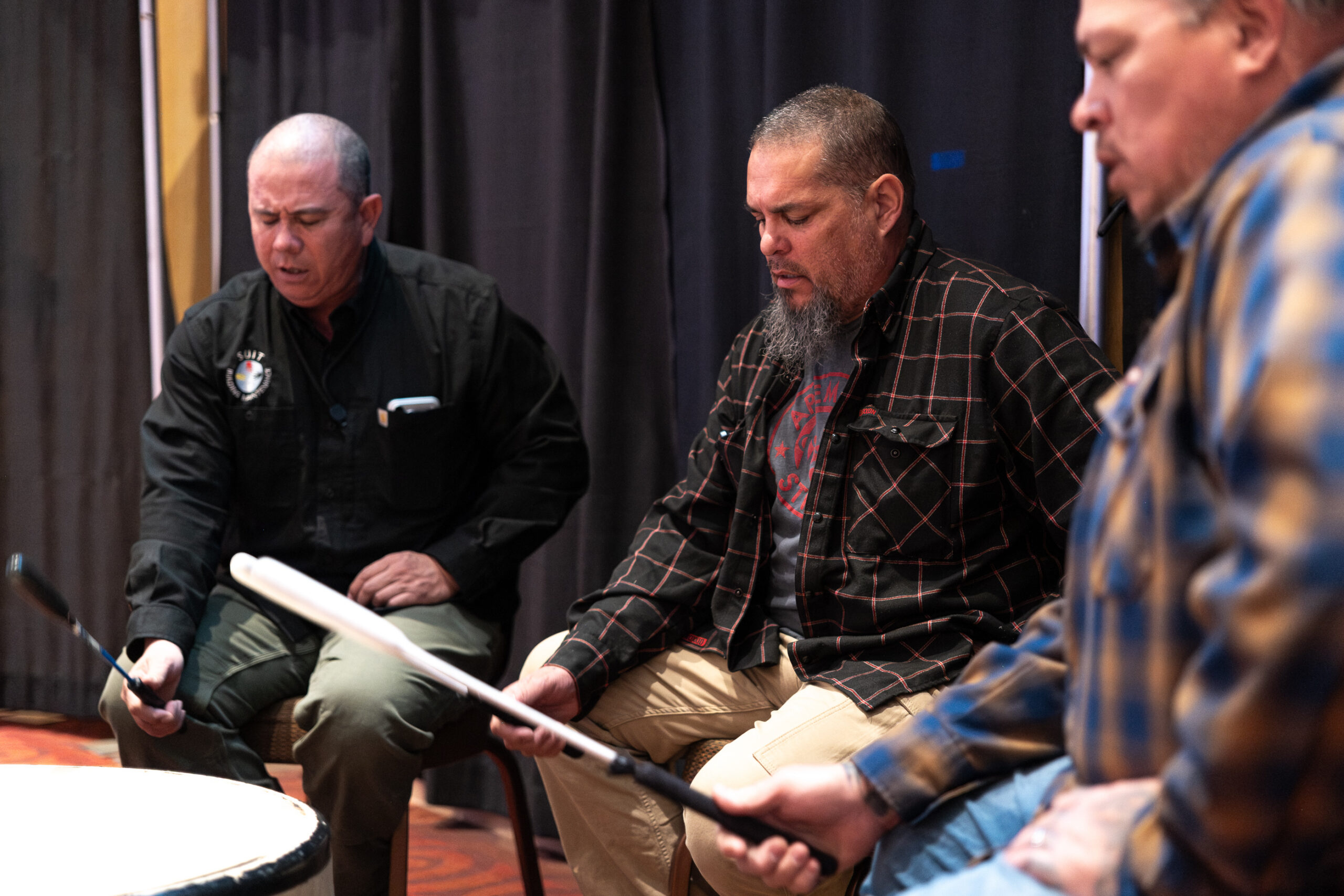 The Yellow Jacket Singers – Tim Ryder, Ian Thompson and Tyson Thompson, open the program with a prayer song. (Not pictured are – Sam Burch, Johnathan Chavarillo and Conrad Thompson).