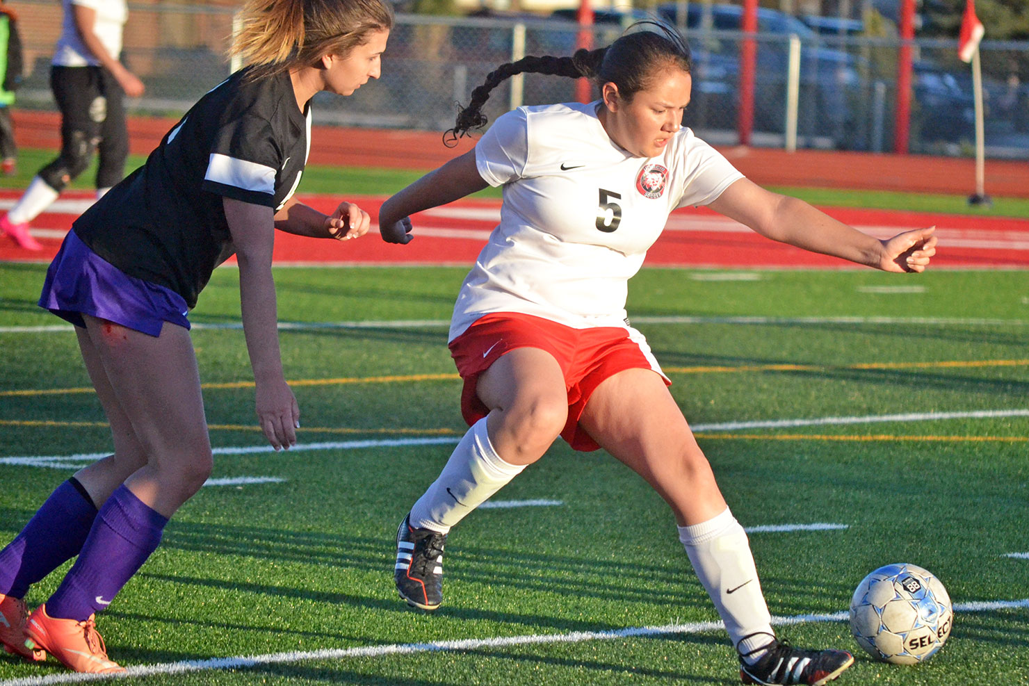 Ignacio’s Allisianna Baker (21) controls the ball against Bayfield’s Lexa Fleming (9) during 3A/2A Southwestern League play April 19th beneath the IHS Field lights.