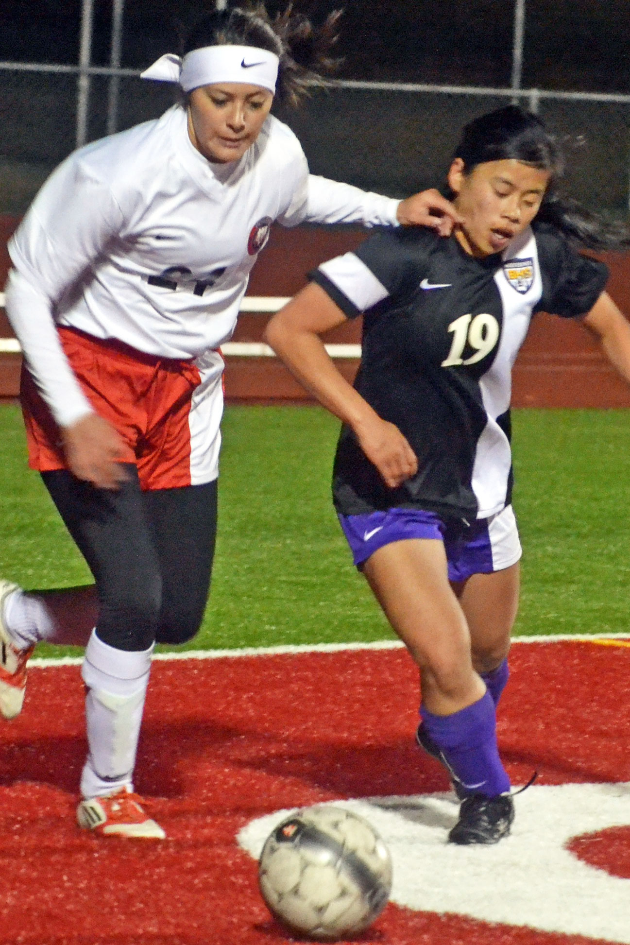 Ignacio’s Selena Cook (24) fends off Bayfield’s Sophie Turner (19) while clearing the ball from within the defensive third during 3A/2A Southwestern League play April 19th beneath IHS Field's lights.