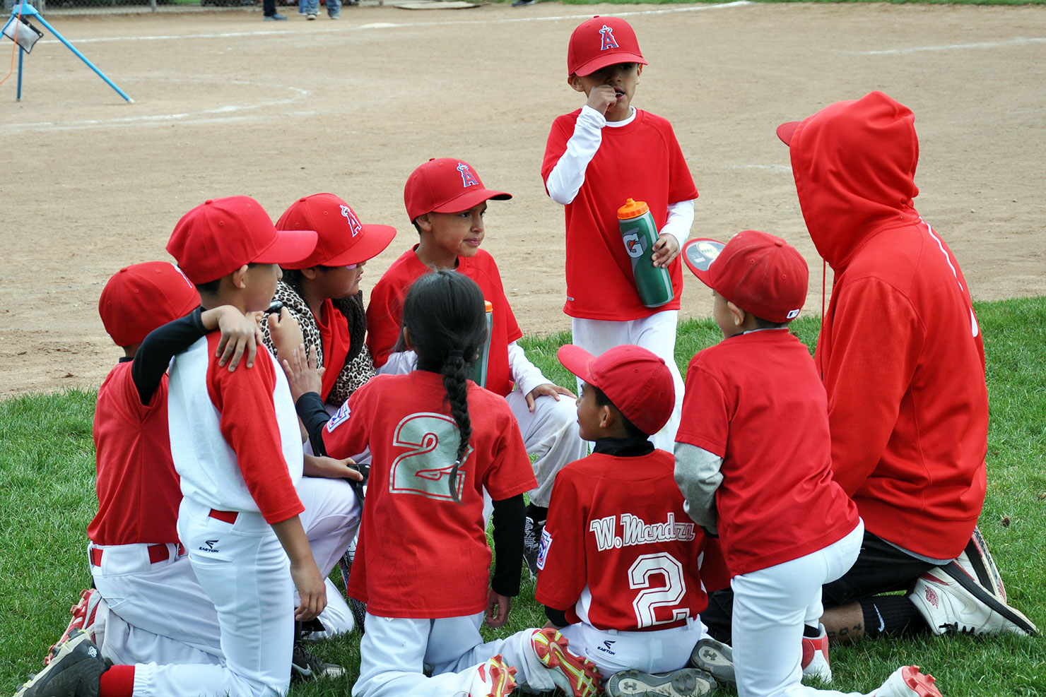 Ignacio Angels youth baseball team take time after their game, Saturday, May 7 at the Ignacio Town Park baseball field.
