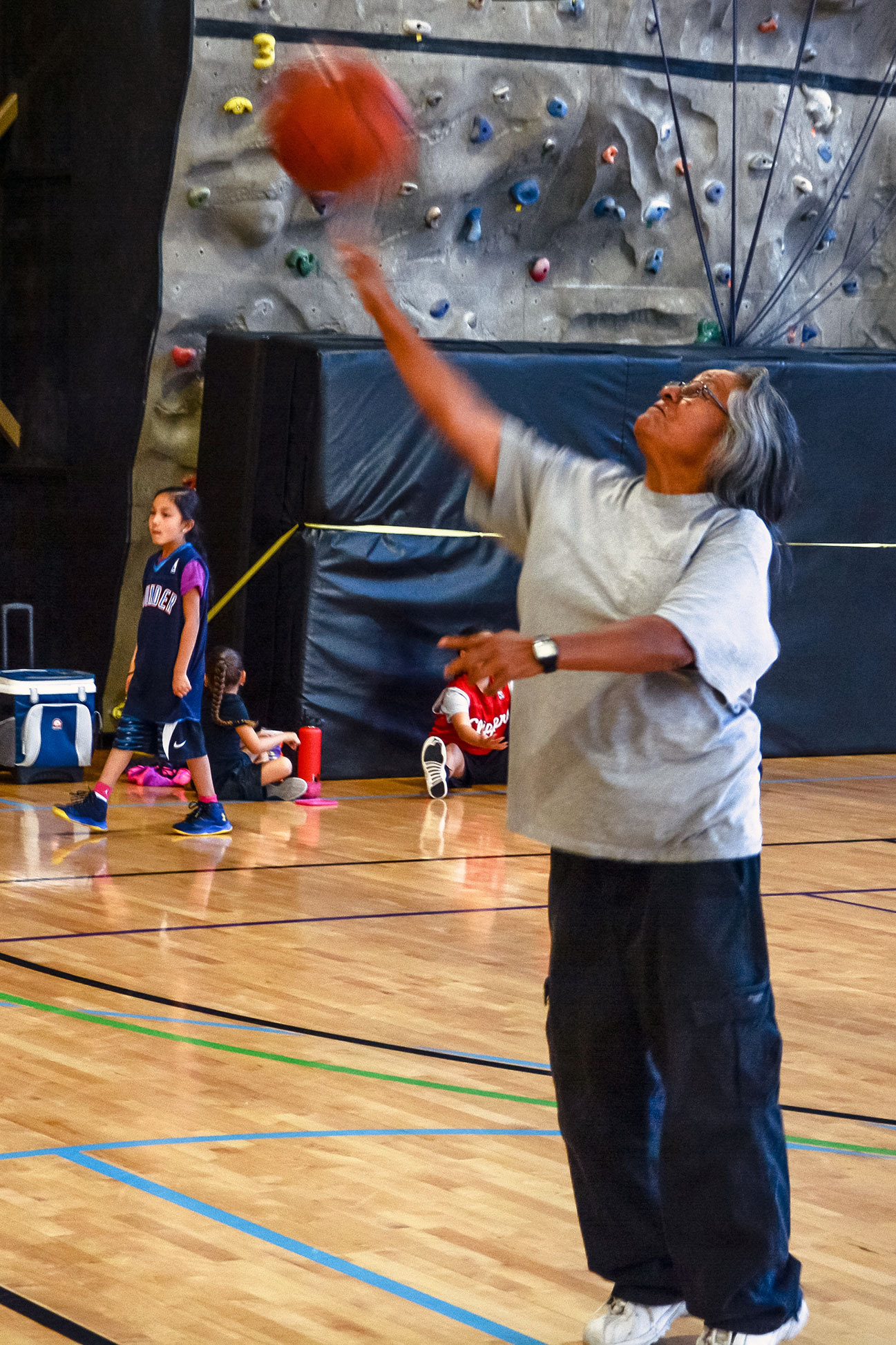 Tribal elder, Ann Weaver takes her turn at free throws during the NB3Fit Day adult free-throw contest.