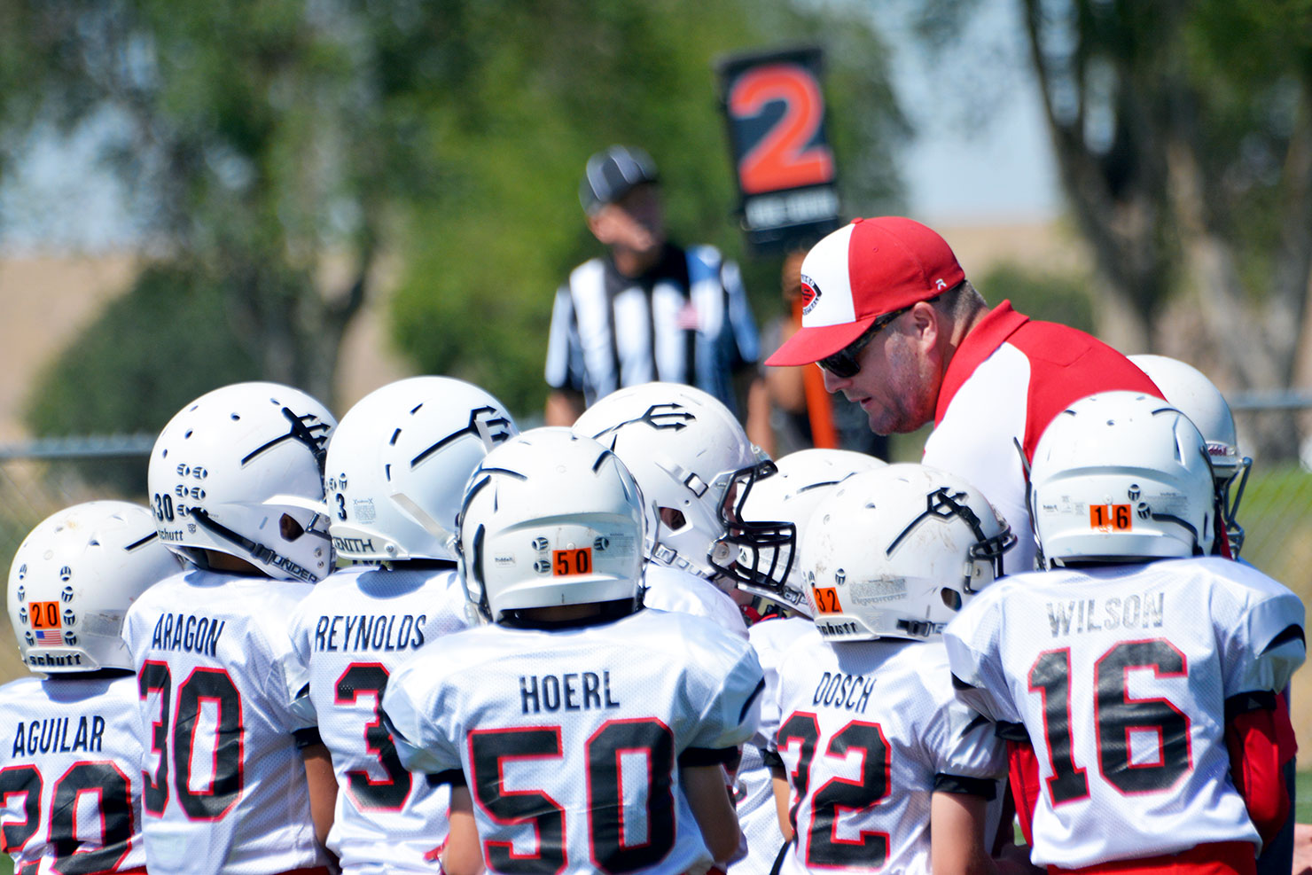 A Durango Demon youth football coach huddles the youth football team giving instructions on the next play.