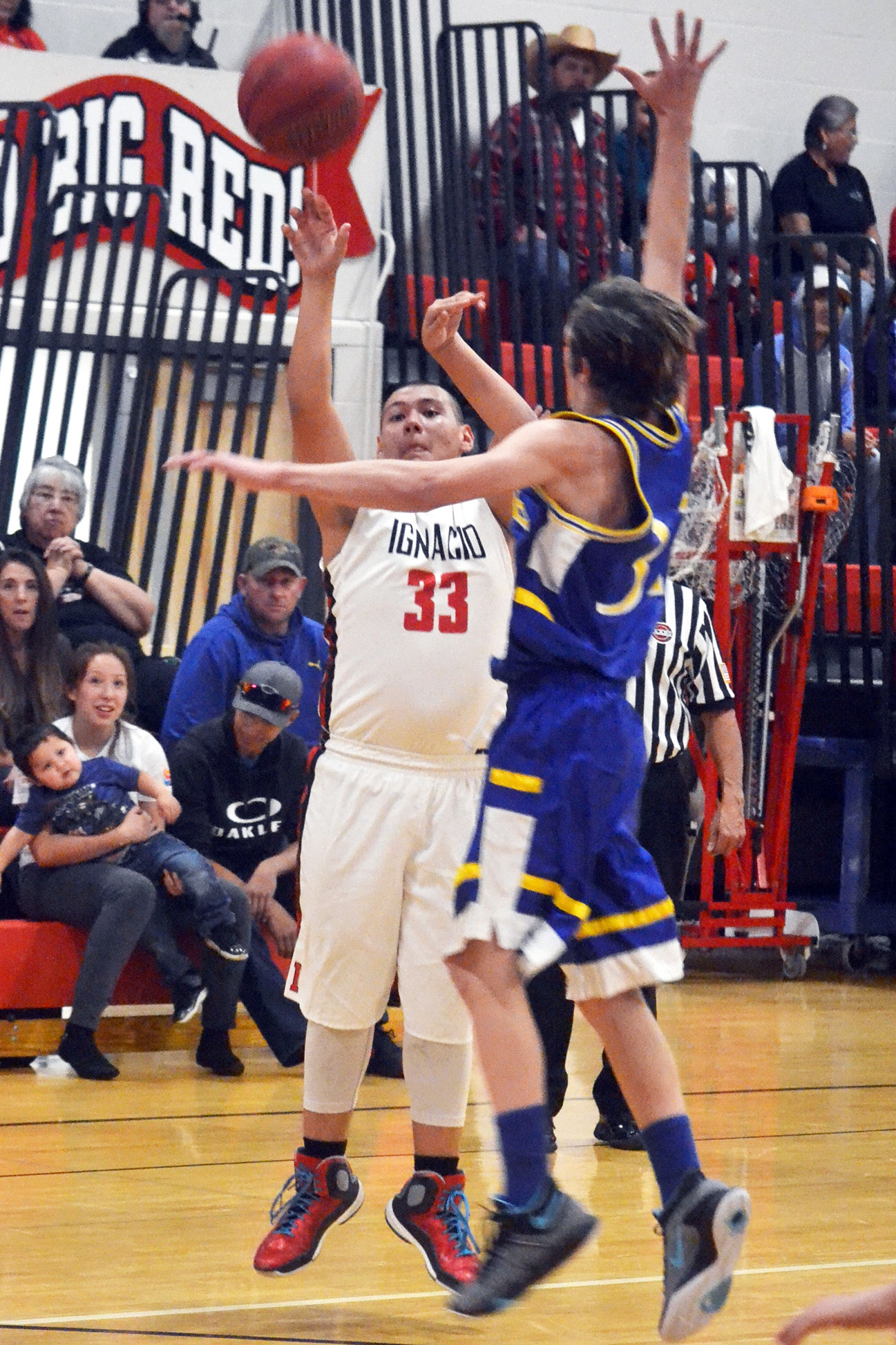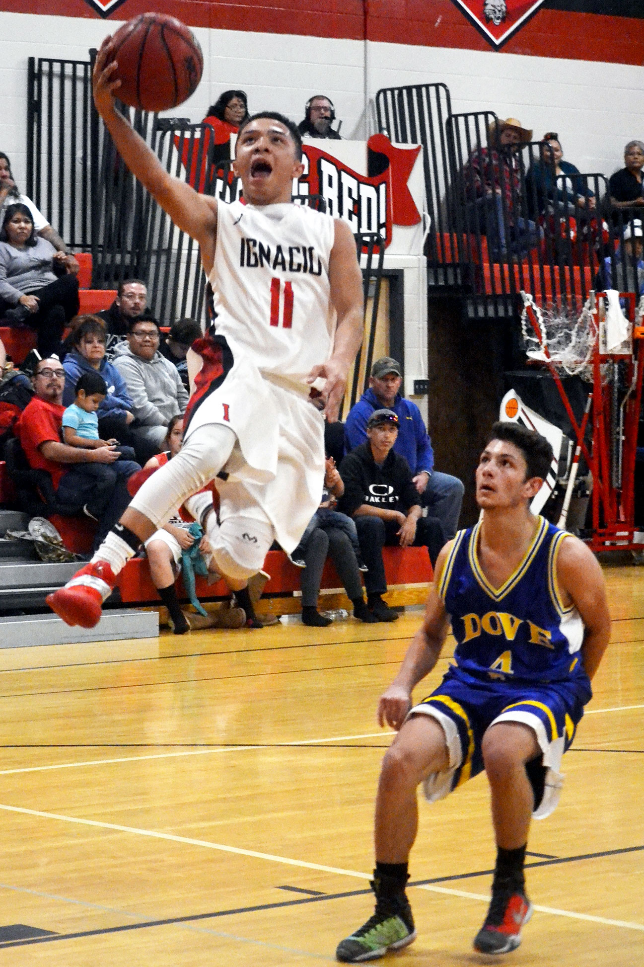 Back-to-back treys by Johnny Valdez and Lawrence Valdez increased Ignacio’s lead to 11-0, forcing DCHS to take a timeout with 5:59 still left. Senior guard Cole McCaw, however, resumed play with another three, and the onslaught reached 26-0 when Roubideaux drained another triple after Lawrence Valdez saved the ball from going out of bounds with 3:00 remaining.