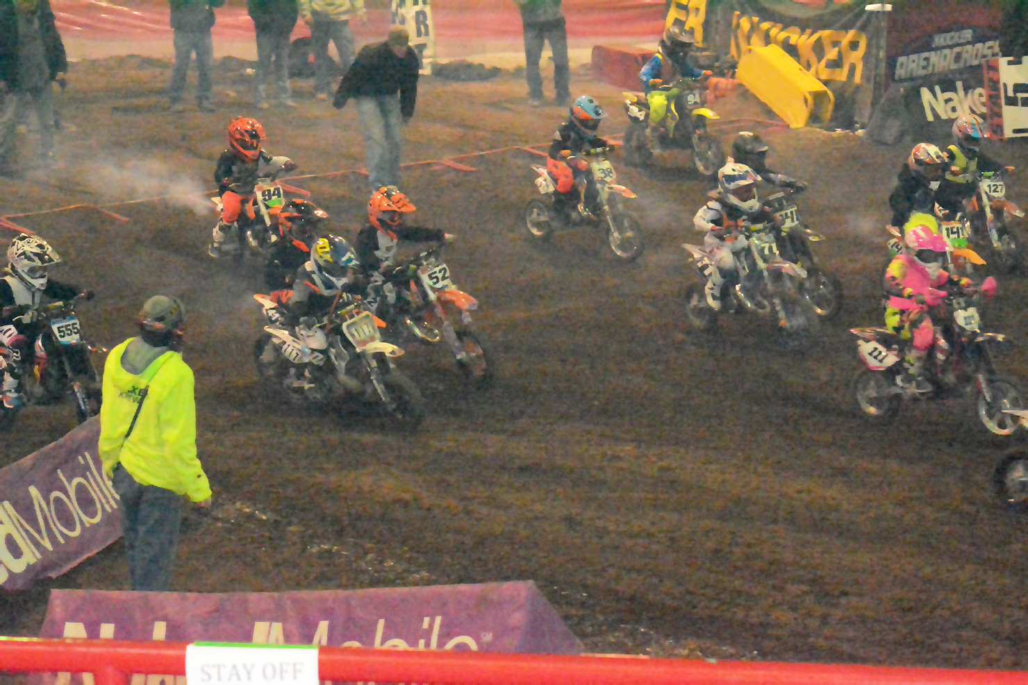 Shyla Cloud (555), Zachariah Loundeberg (94) and Stephen Romero (127), head for the first turn in the 50cc Outlaw Class race.