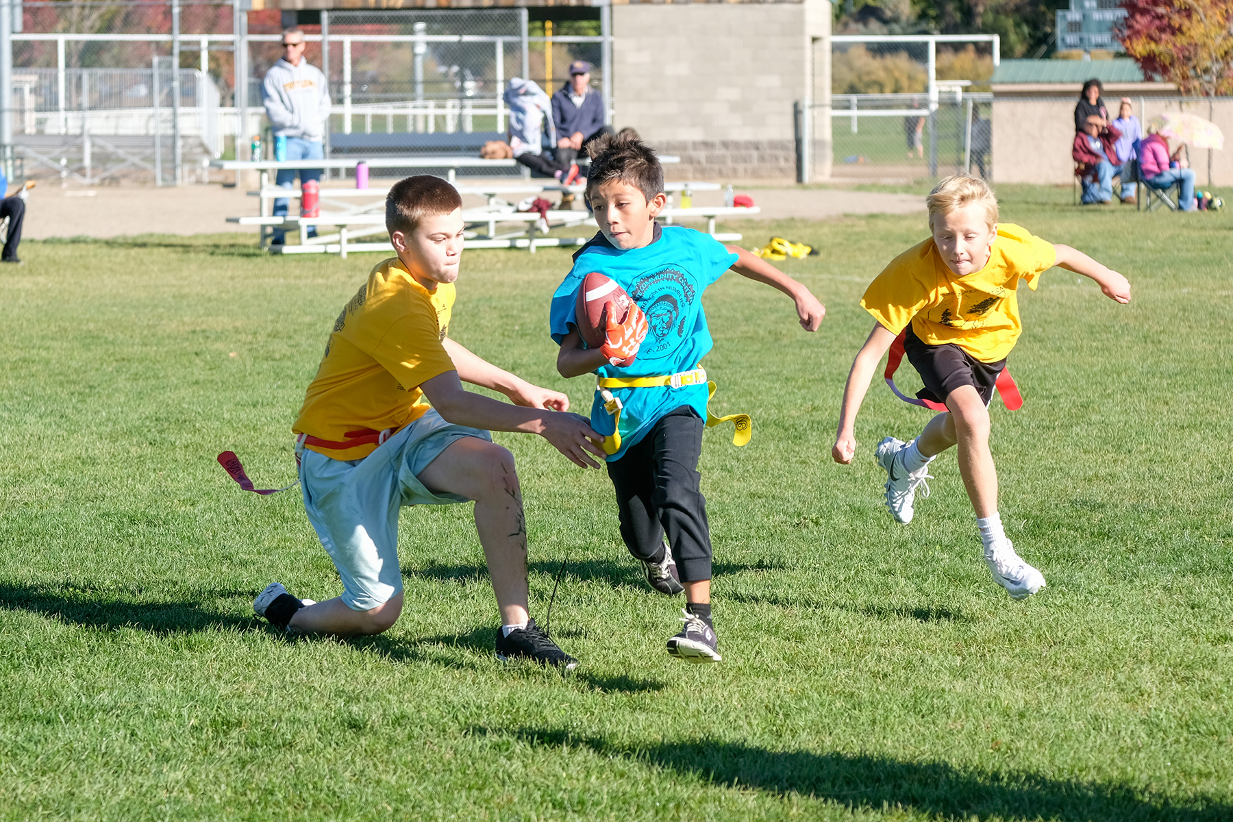 Aven Bourriague is pitched the football and takes off running trying to dodge the other team.