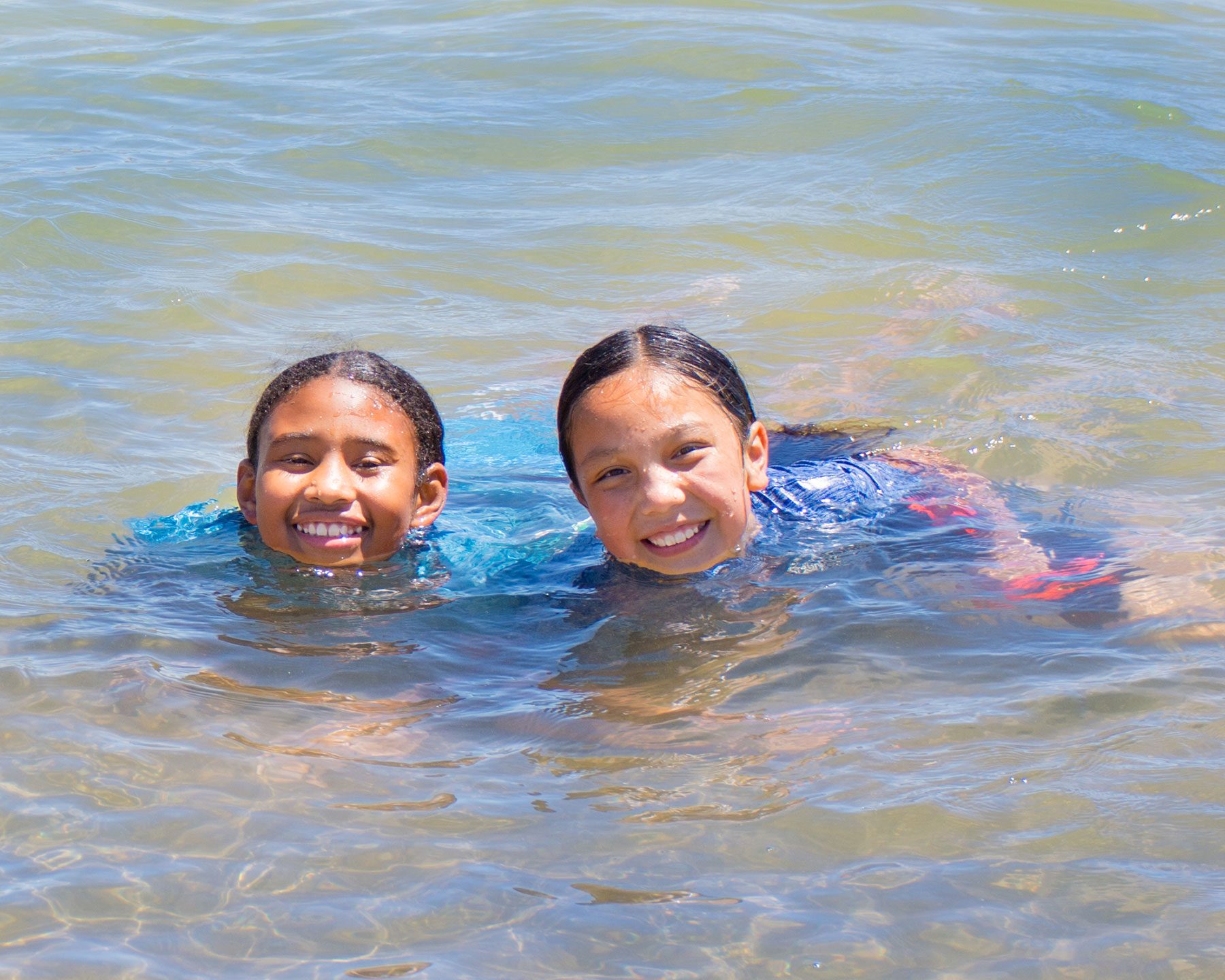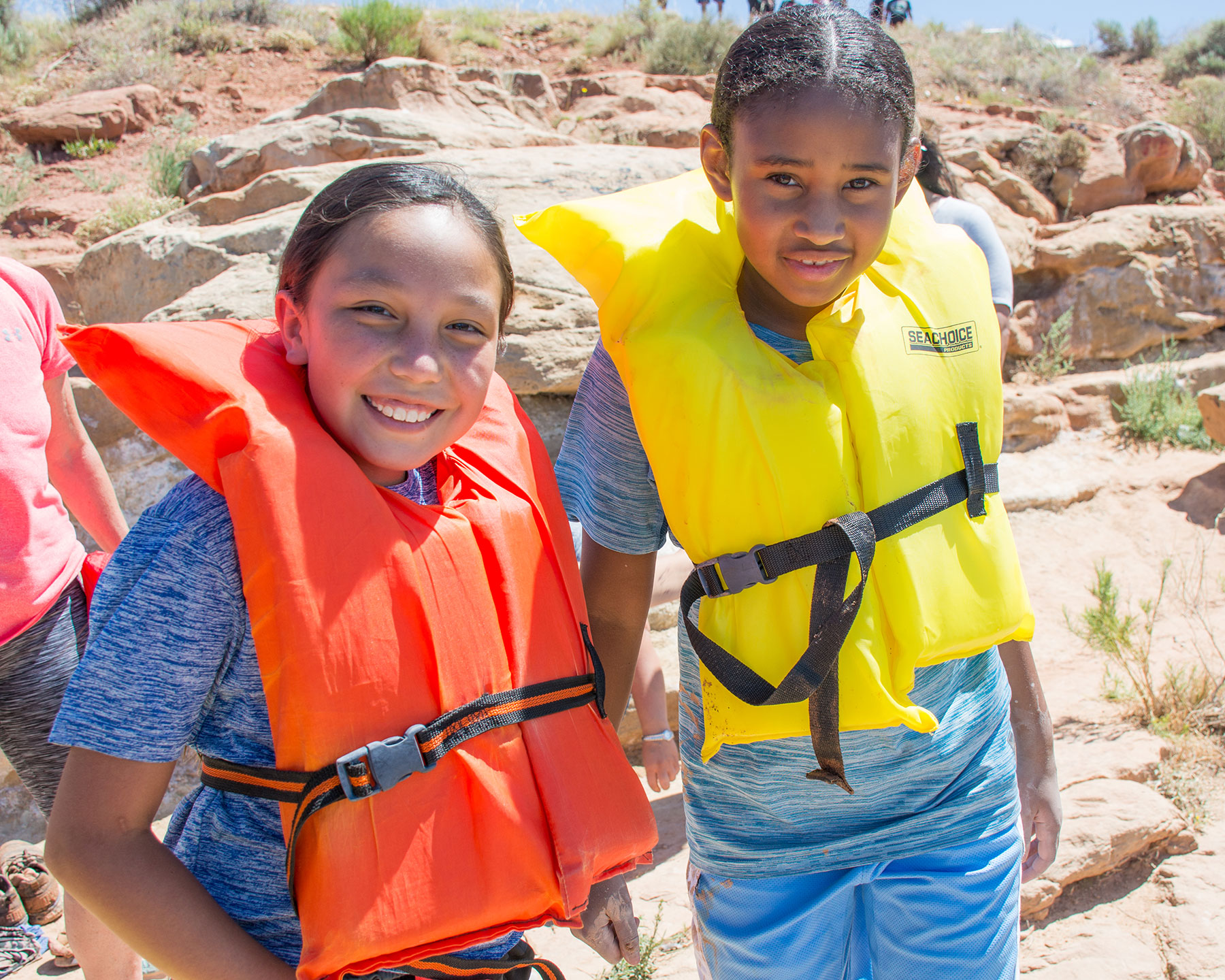 Southern Ute Athletes, Kieley WhiteThunder and Jaelyn Alston flash a quick smile before they jump into the Bottle Hollow Reservoir and swim across to complete the Ultimate Ute Warrior Challenge.