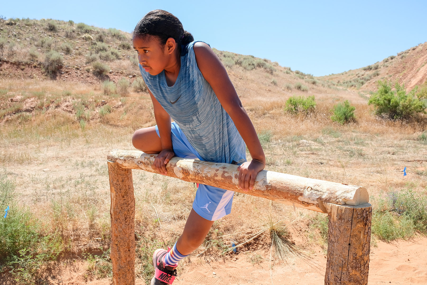 Jaelyn Alston, sweaty and tired pushes herself to make it over the hurdles after running through the tough terrain.