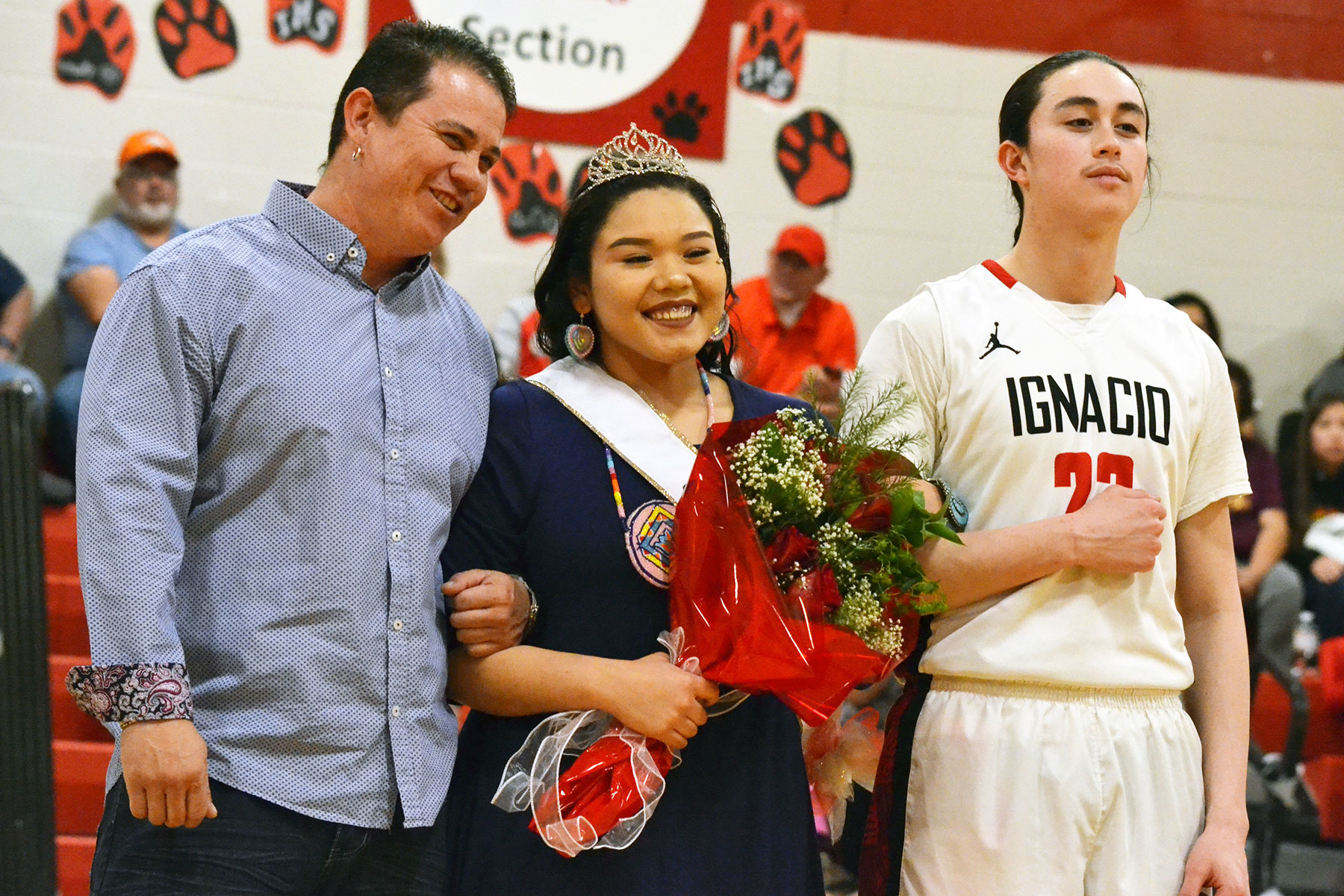 At halftime of the Ignacio High School boys’ Feb. 15 varsity basketball game versus Ouray, the school’s SnowComing 2020 Winter Royalty was announced and presented to all inside IHS Gymnasium. Senior Bird Red (23) was named King and, flanked at left by her uncle Tim Ryder, senior Helaina Taylor a beaming Queen.