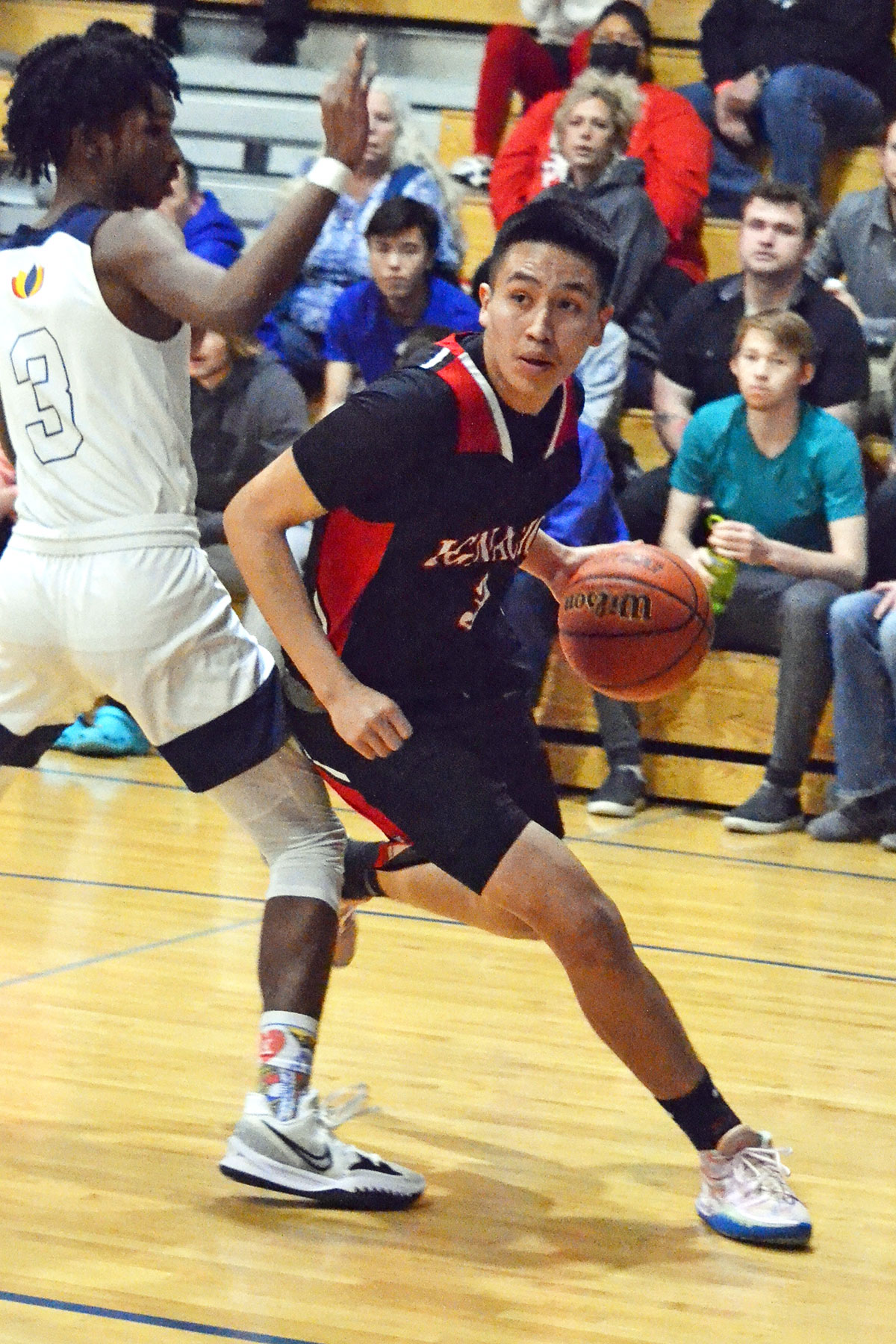 Ignacio's Gabe Tucson (3) turns baseline around a Lotus School for Excellence defender during 2A-Region IV action at neutral Vail Mountain H.S. late in the 2021-22 season. Tucson earned First Team All-SJBL and Honorable Mention All-2A honors at season's end.