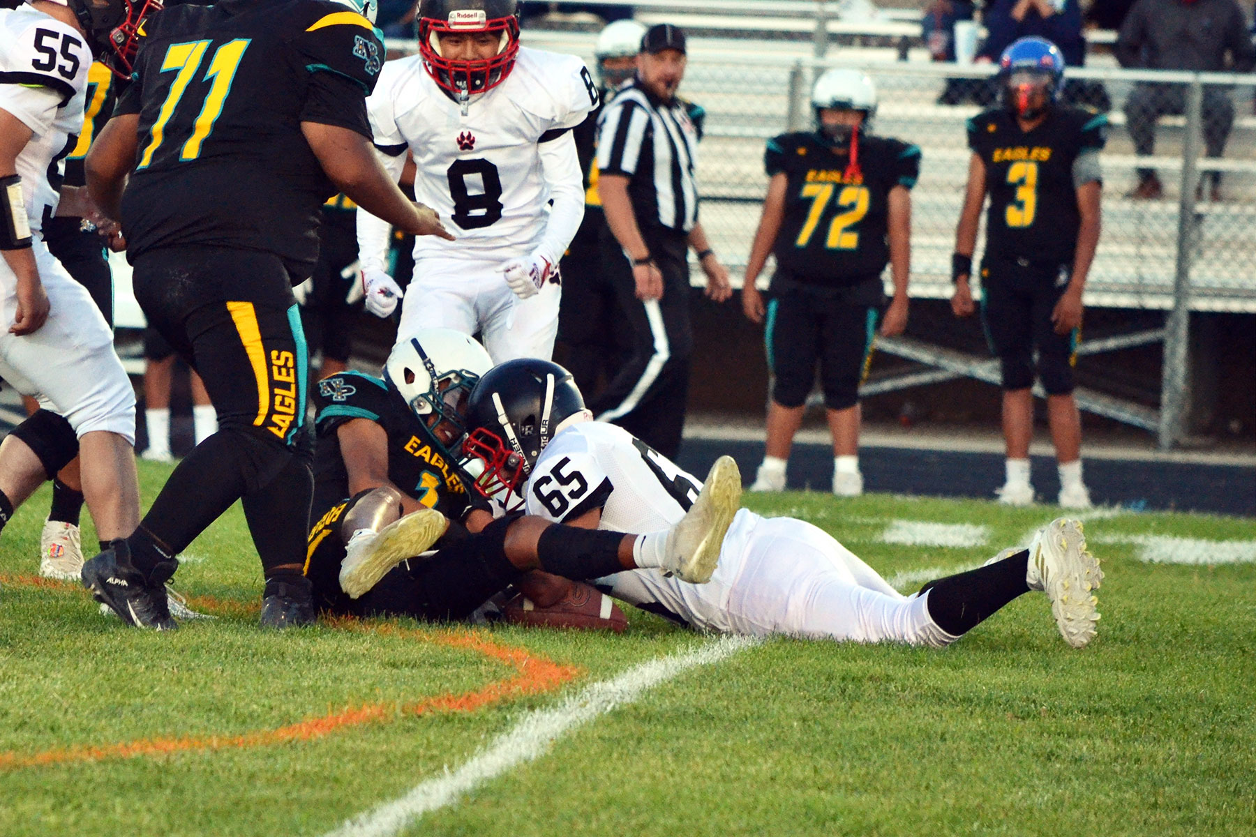 Maez then somehow covered Dunbar’s next squibber at the IHS 49, but though the resulting drive died on downs after eight plays, the Eagles (0-4, 0-0 Dist. 1-3A) only regressed after starting at their own 19. Four consecutive penalties, before the ball was even snapped to backup QB A.J. John, pushed the ball back to the 2, and on first-and-27, Yazzie had no choice but fall upon a botched center-quarterback exchange and concede the ’Cats a safety with 4:57 left.