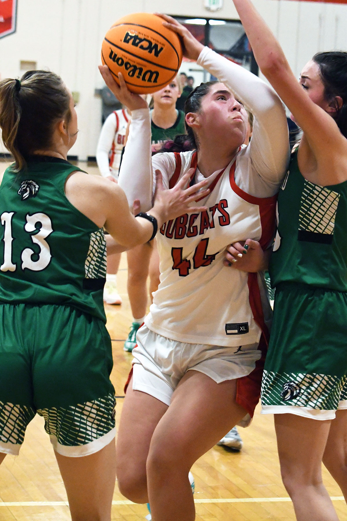 Sophomore Alyssa Atencio logged four points and junior DaLaney Wesner two in what was a come-from-behind effort almost since the Lady ’Cats lost an early 3-0 lead, having blanked SHS for the first 4:10 of the contest. The Lady Mustangs went into the second stanza leading 12-7, and widened the gap to 27-14 at halftime after freshman Claire Crowther sank two technical-foul free throws – in response to two awarded to, and made by Olguin at the other end – with 0:03.4 left on the scoreboard clock.