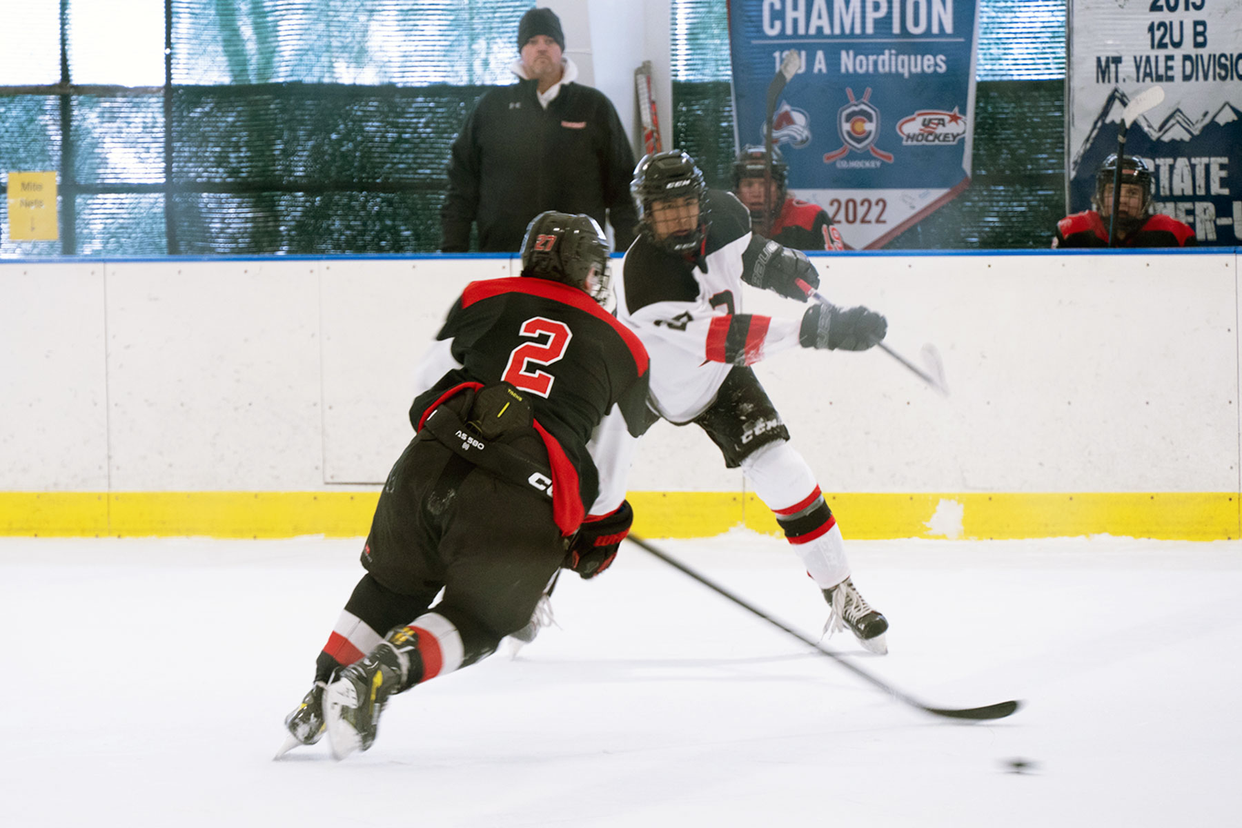 Southern Ute tribal member, Keevin “KJ” Reynolds #27, shoots the puck past a Glenwood Springs player during JV high school ice hockey action at the Chapman Hill Ice Rink in Durango, Colo. The Durango Demons hosted the Glenwood Springs Demons, Friday, Jan. 5 and Saturday, Jan. 6 losing two games, 0-4, and 2-4. The Durango Demons JV boys ice hockey team are currently 2-4-2 Overall, and 2-4-2 in League standings, according to MaxPreps.