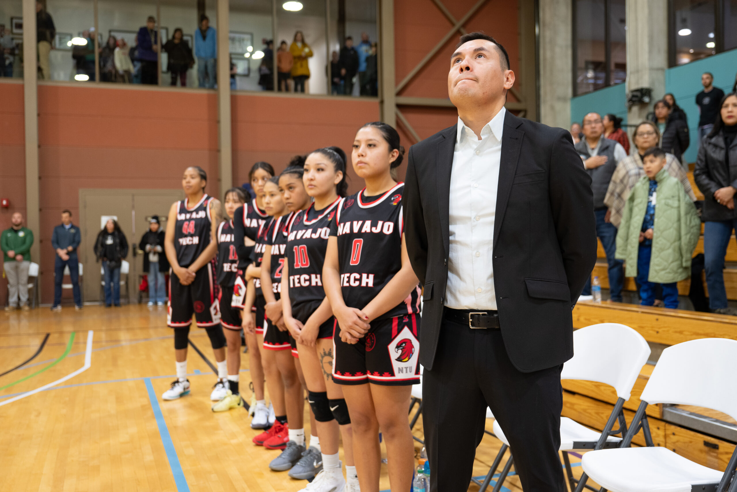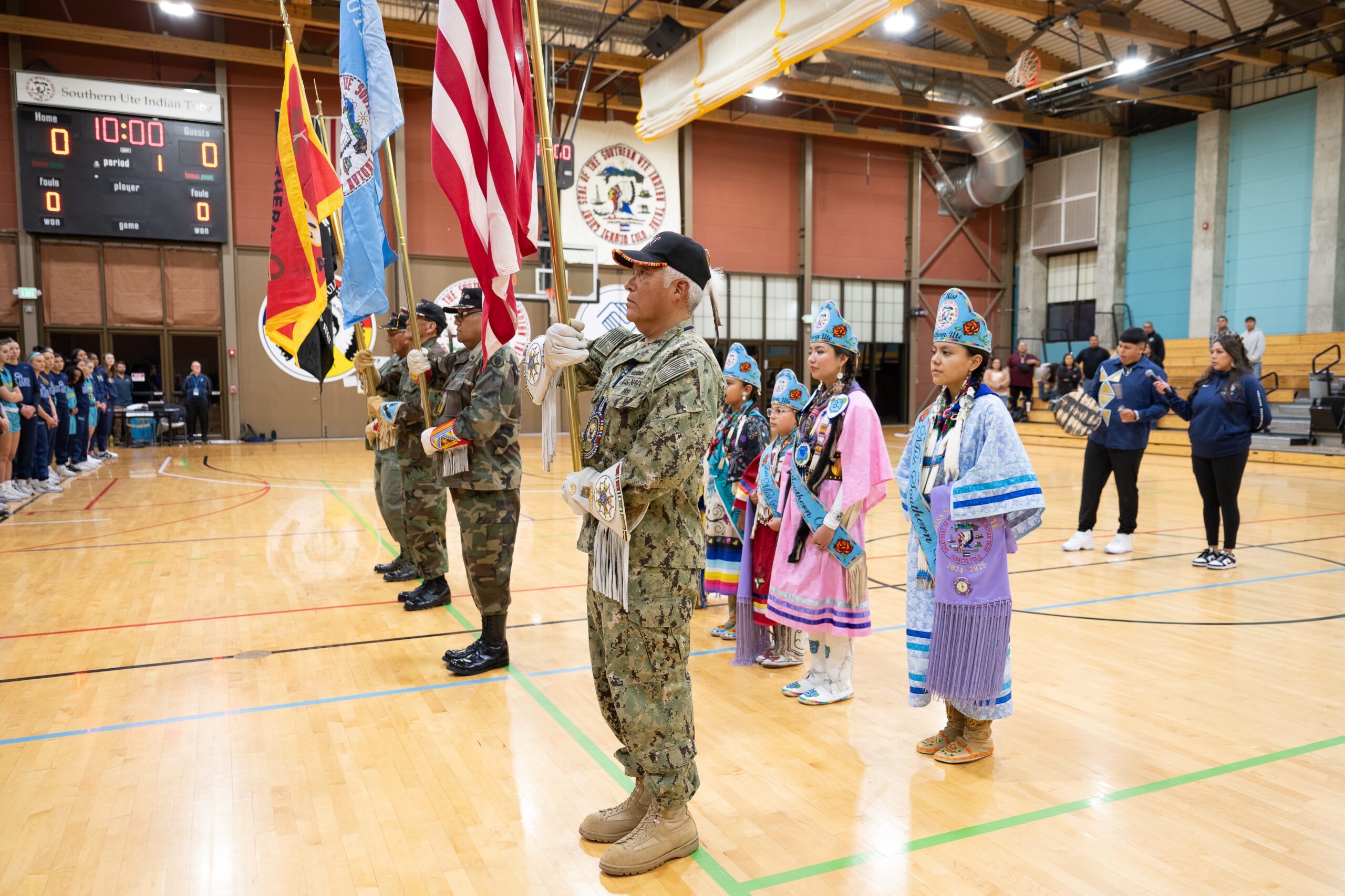 The Southern Ute Veterans Association, Southern Ute Royalty, and Stoney White Thunder-Lucero perform ahead of the women’s game during the Native American Heritage NCAA Games in the SunUte gymnasium.